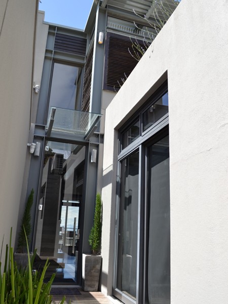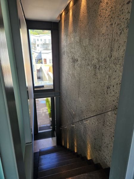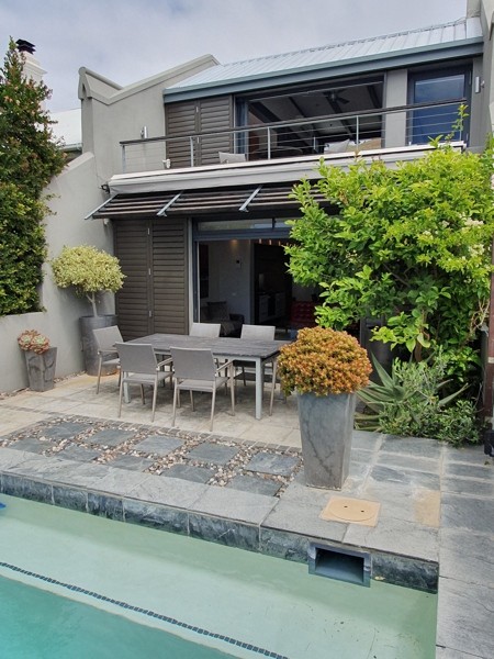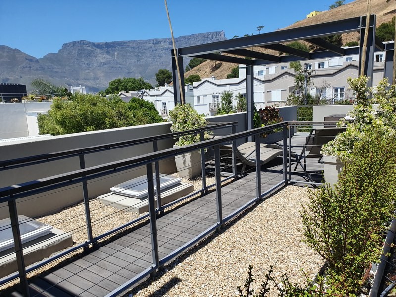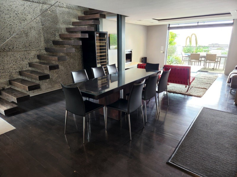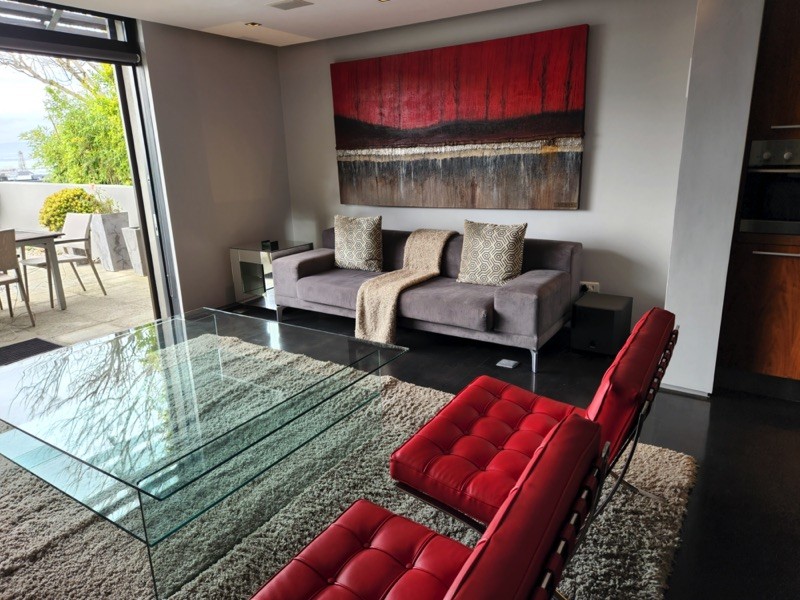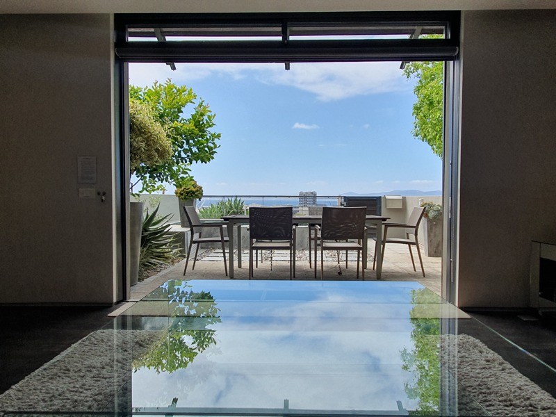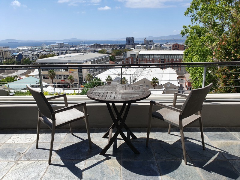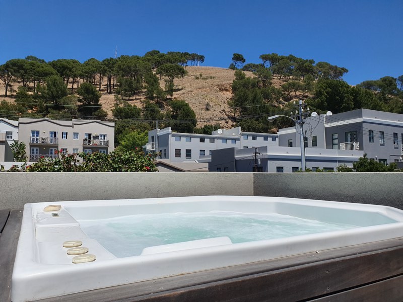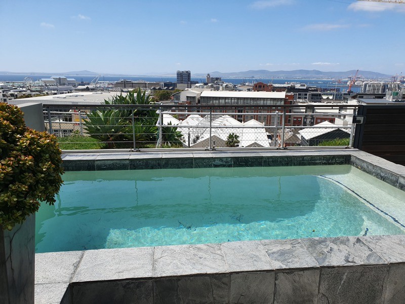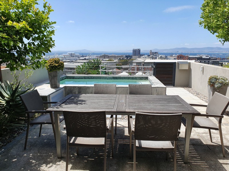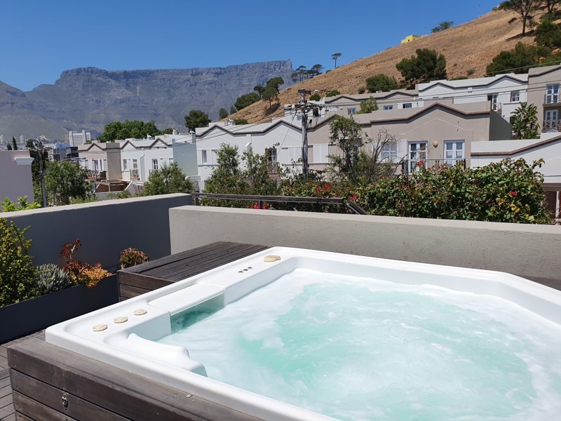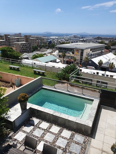 Clever wooden floating stairs lead you to the master air-conditioned bedroom, here you can enjoy harbour views from the bed that overlooks a balcony. There is a freestanding bath behind the bed that also enjoys the same views with glass walled shower and toilet. The rear sun deck has a 8 seater hot tub that can either be accessed from the external staircase next to the garage or through the master bedroom’s en-suite. This area has amazing views of Table Mountain and Signal Hill.