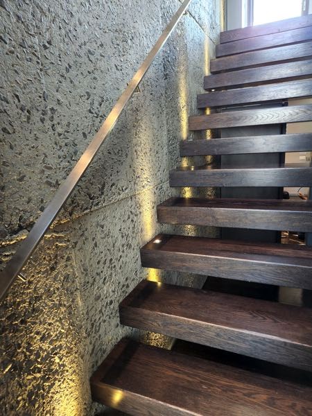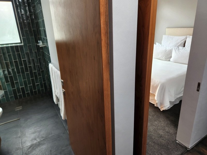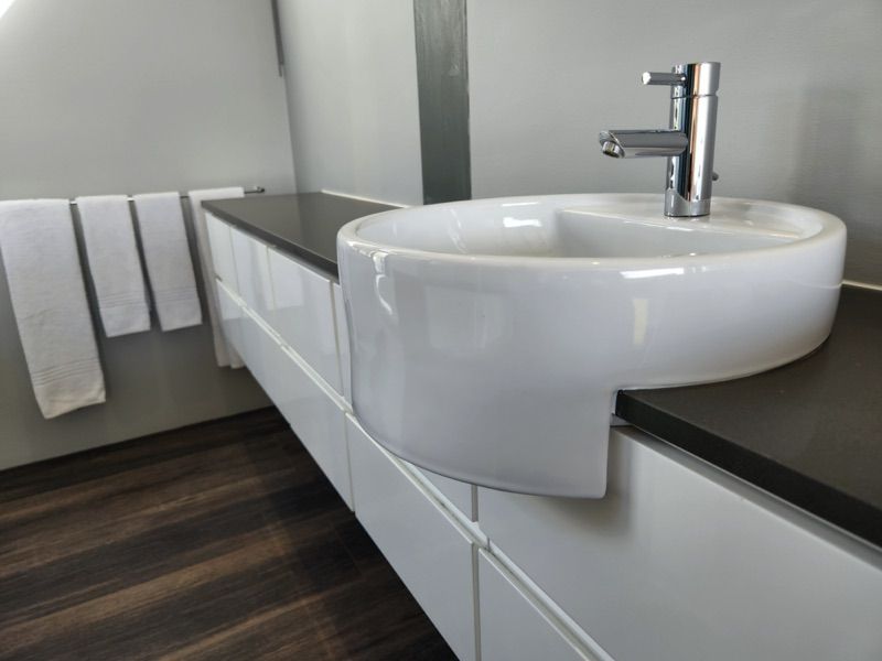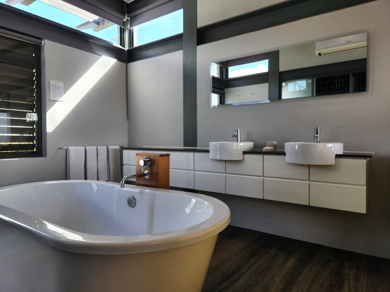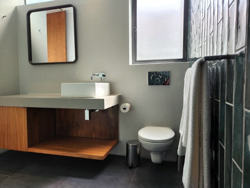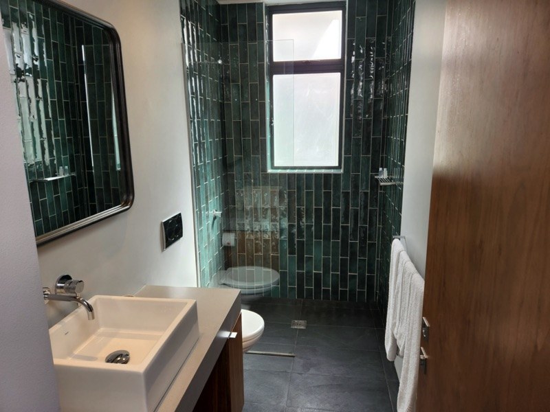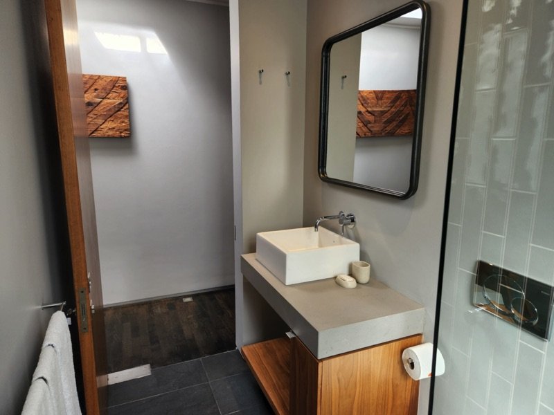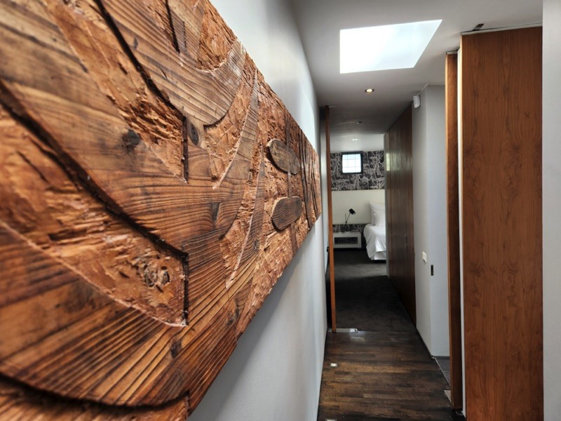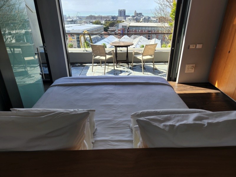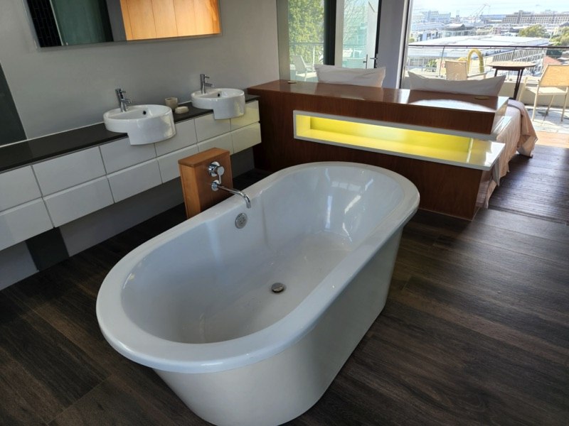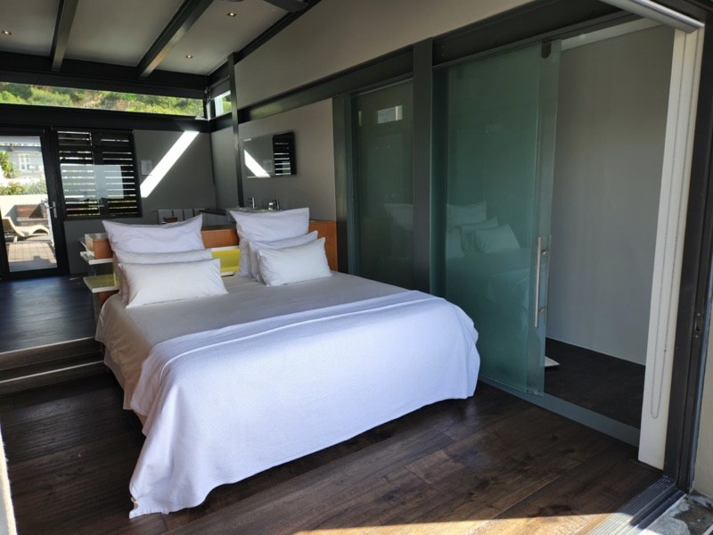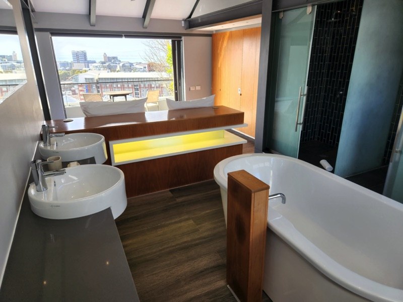 Clever wooden floating stairs lead you to the master air-conditioned bedroom, here you can enjoy harbour views from the bed that overlooks a balcony. There is a freestanding bath behind the bed that also enjoys the same views with glass walled shower and toilet. The rear sun deck has a 8 seater hot tub that can either be accessed from the external staircase next to the garage or through the master bedroom’s en-suite. This area has amazing views of Table Mountain and Signal Hill.