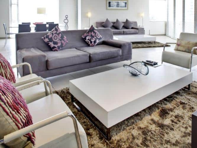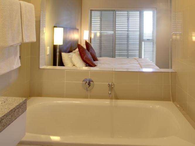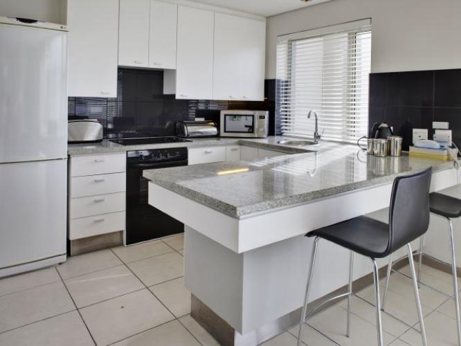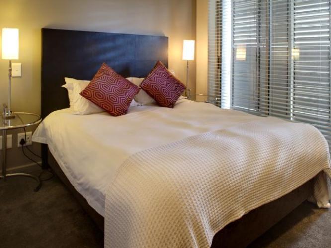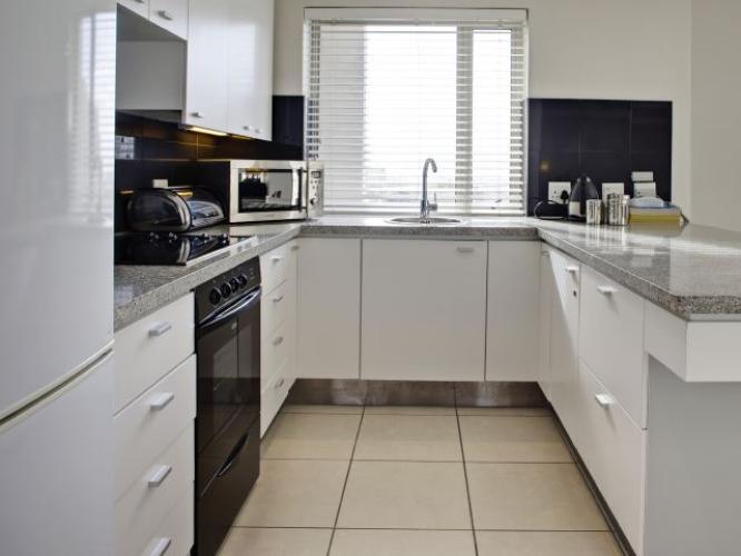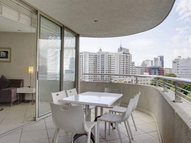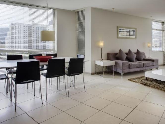Exclusive, serviced apartment conveniently situated in close proximity to the Cape Town International Convention Centre as well as the V&A Waterfront. The apartment is elegantly furnished in a modern contemporary style. The apartment is fully equipped, air – conditioned and fitted with broadband Internet. The apartment is elegantly furnished in a modern contemporary style. The apartment is fully equipped, air conditioned and fitted with broadband Internet. There is a double bedroom with built in cupboards and en suite bathroom fitted with a bath and separate shower. The second bedroom has twin beds and has a separate bathroom fitted with a shower. The fully fitted kitchen leads into the open plan dining room and double lounge, living area. As the apartment is a corner unit, the balcony offers panoramic views over Cape Town, Table Bay and Table Mountain.