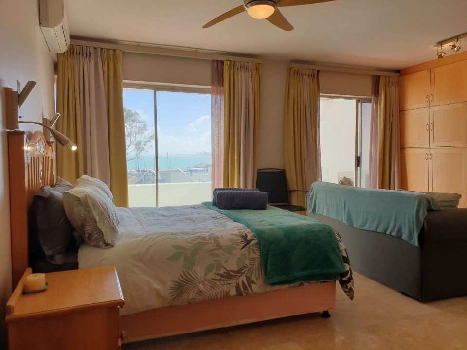 Our open plan layout flows into a sunny living room with wall to wall windows allowing gorgeous sunlight to flow in and 180 degree views of the yachts and ocean beyond. The upper floor of the apartment is an entertainer’s dream with its large dining table, comfy day bed and a second kitchen with indoor braai facilities. Perfect for families of 6 or less to enjoy all the space and comfort needed for a fantastic holiday experience.