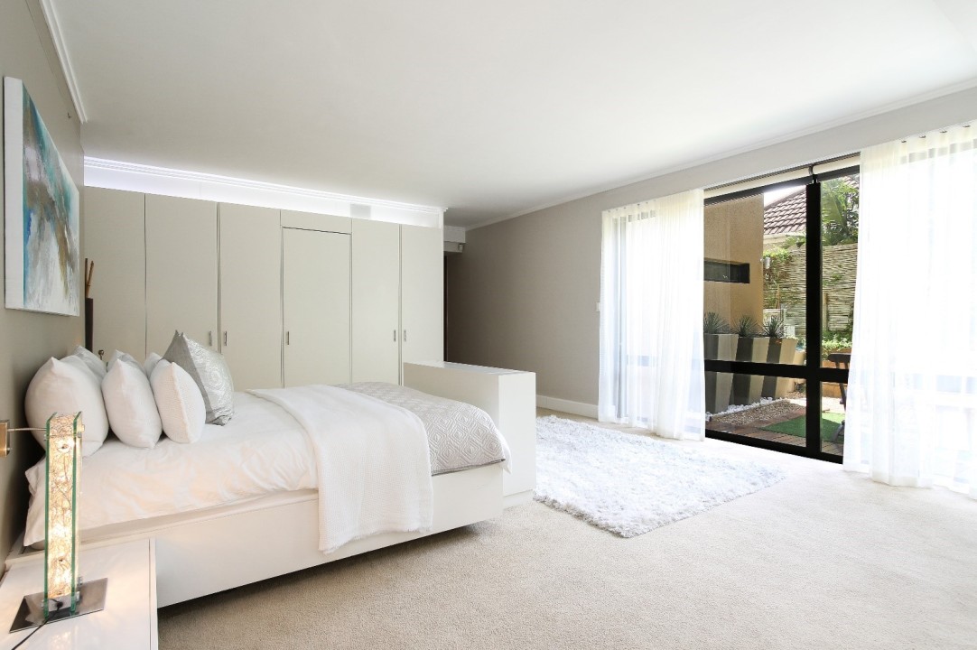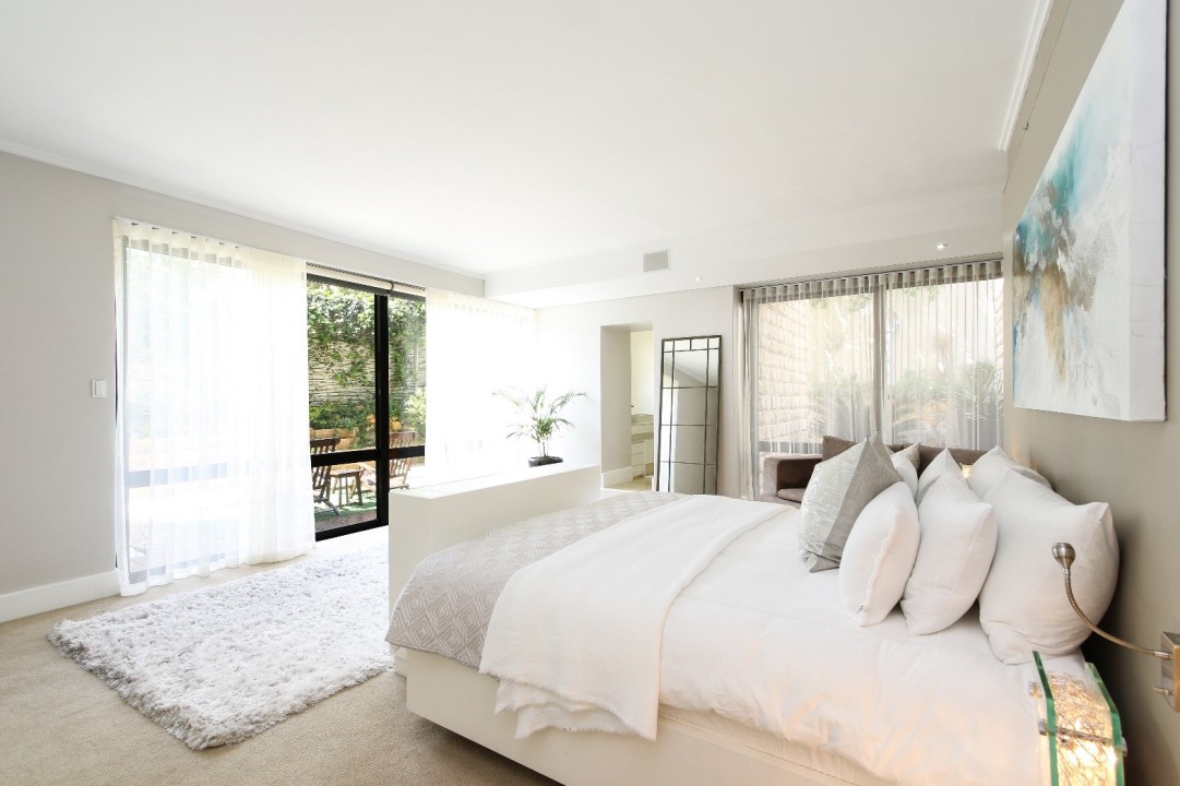 BEDROOM 1|King-size bed with a private garden and patio, en suite full bathroom with amenities, towels and linen. Air-conditioned and heated.TV & Alexa fully automated.