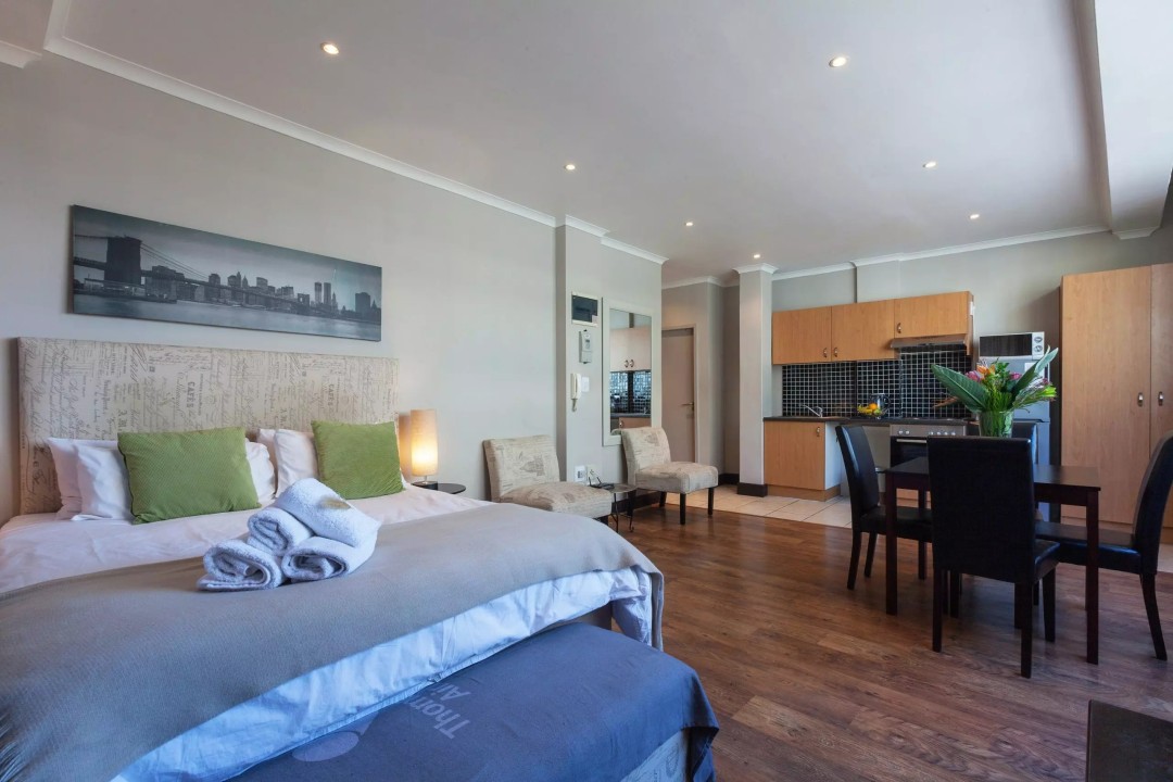A modern spacious designed self-catering studio apartment on Old Town Square, centrally located in the CBD. The complex features a pool and gym area. Situated on the corner of the building with large windows and great views, especially towards Table Mountain and a part of the city.