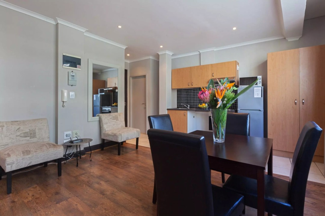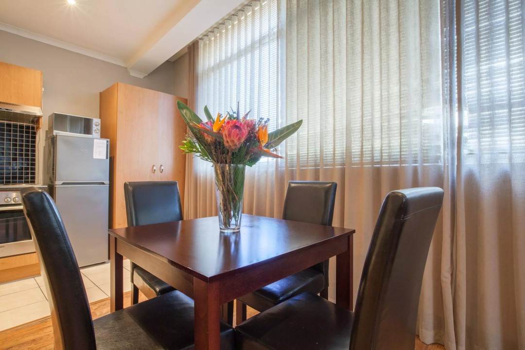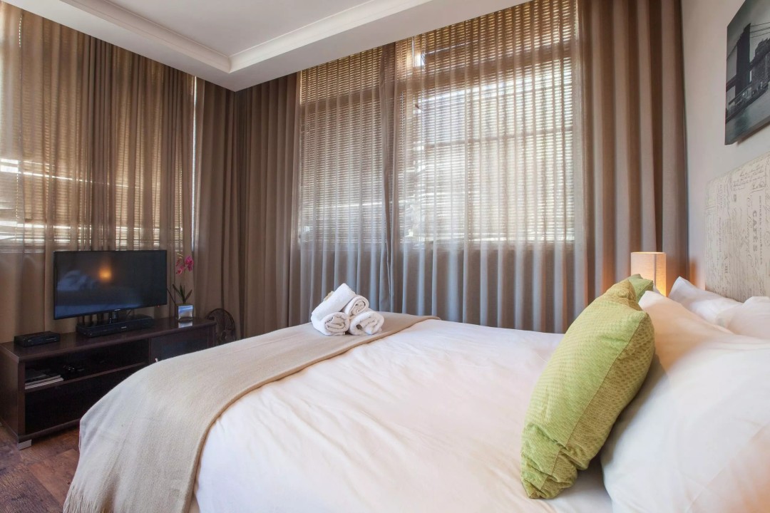 From opening the door to the beautifully modern designed studio apartment, you receive the warm welcoming feeling the city has to offer. The open space of the apartment is perfect for corporate times through to the exclusiveness of a couple wanting to be part of the city as well as enjoy the amazing view of Table Mountain through the wide windows. The bathroom is on your immediate right from entering the apartment which is perfect after a long trip to Mother City. The bathroom is a perfect size if you want to share it, rather than be alone with a comfortably sized shower. Having the kitchen part of the entire space, you don’t need to be alone when you are preparing a meal. The kitchen is modern and designed to become one with the rest of the space which still allows the chef to come out and play. It is fully equipped for the nights you prefer staying in and cooking with a show playing in the background to heating up the previous night’s takeout. Having the curtains open you can enjoy your breakfast at the dining table with Table Mountain in the background or have a glass of wine keeping yourself entertained with the bustle that the nightlife tends to offer. You can choose from either enjoying a good movie only from the comfort of your bed to falling asleep with the night lights the city tends to offer. You can also choose to enjoy watching a game from one of the single comfortable chairs in the apartment, especially if you get excited about the game that is on and you can’t stay seated for longer than a second.