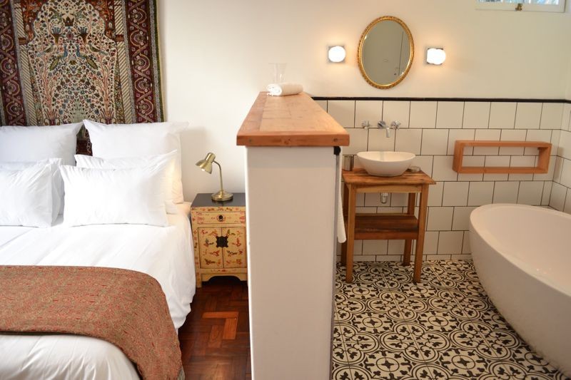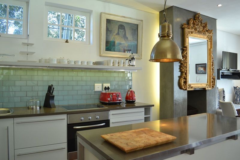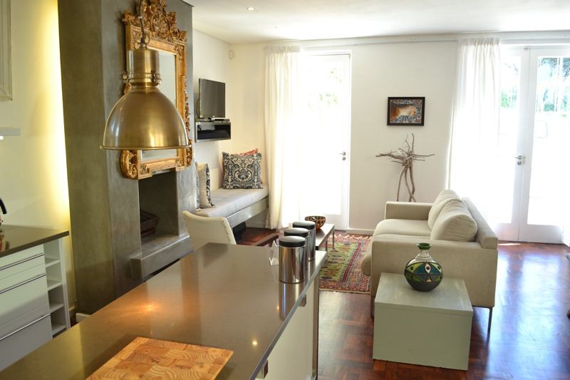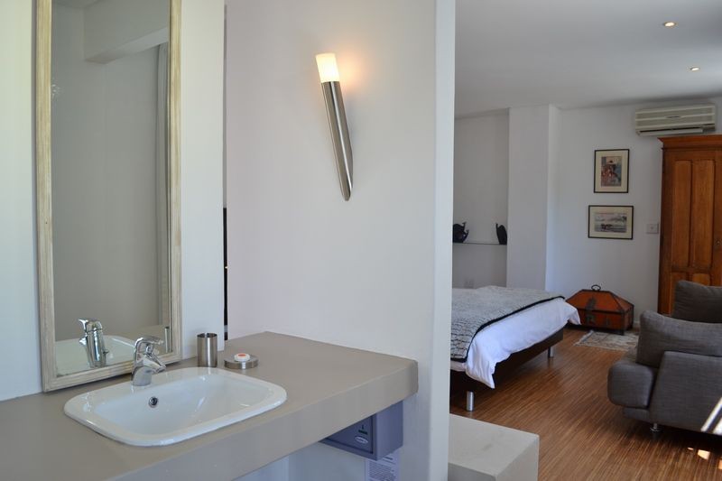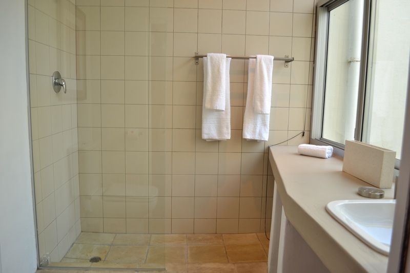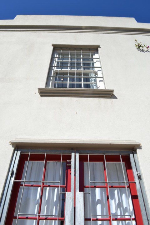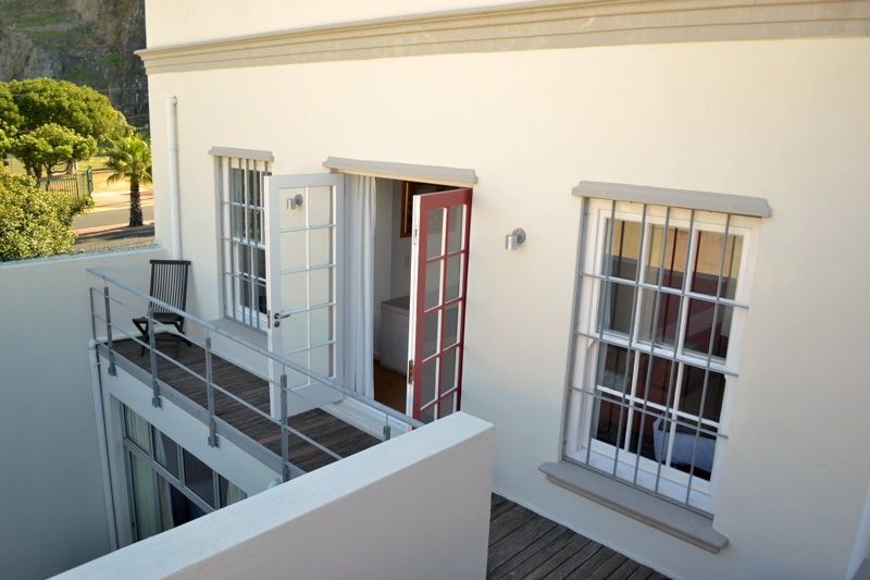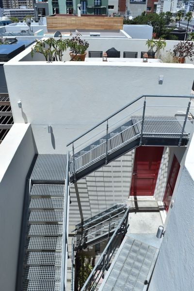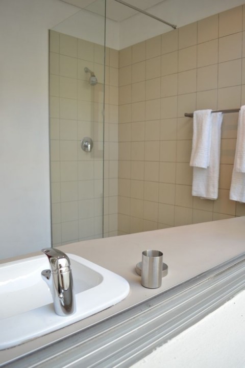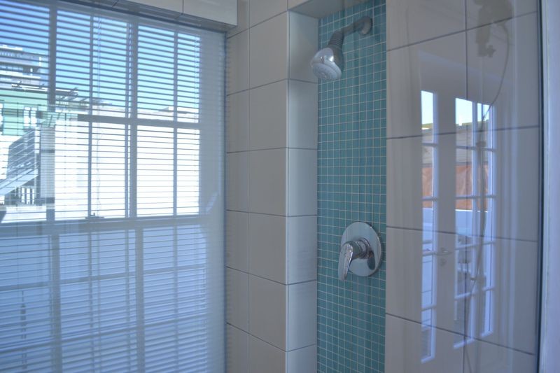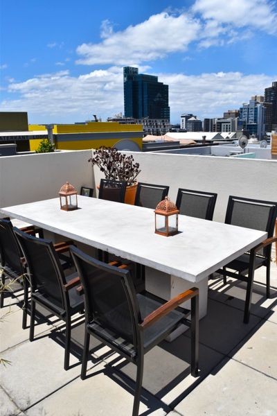 The metal stairs are open air with connecting balconies to the first floor bedrooms 1, 3 & then 2, with a further flight of open stairs to the roof terrace. The large master bedroom 1 stretches the width of the property with open plan shower and separate toilet. French Windows open onto a long balcony with seating area that over looks the courtyard below and has great views of the city and Table Mountain. Bedroom 3 is the middle room with en-suite bathroom and can be made up as king or twin. Located at the front of the house, bedroom 2 spans the width of the property with French Windows looking across the village. Like bedroom 1 this has an open plan bathroom with separate toilet.