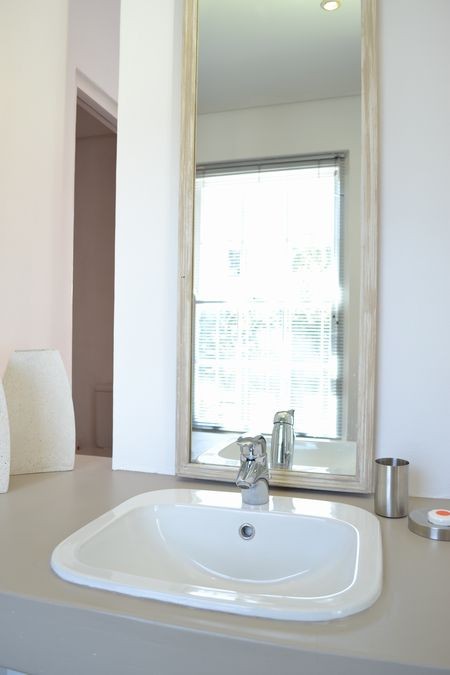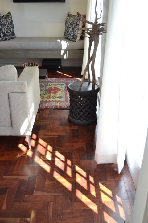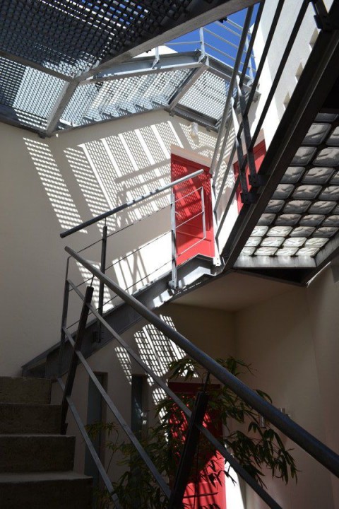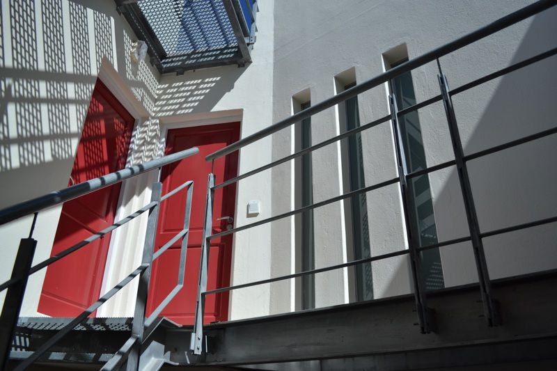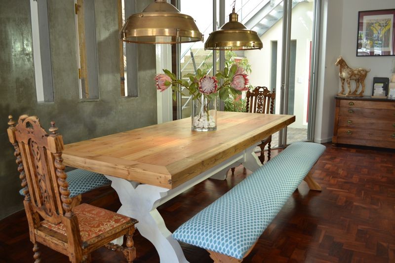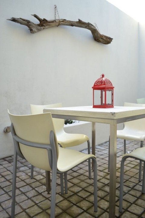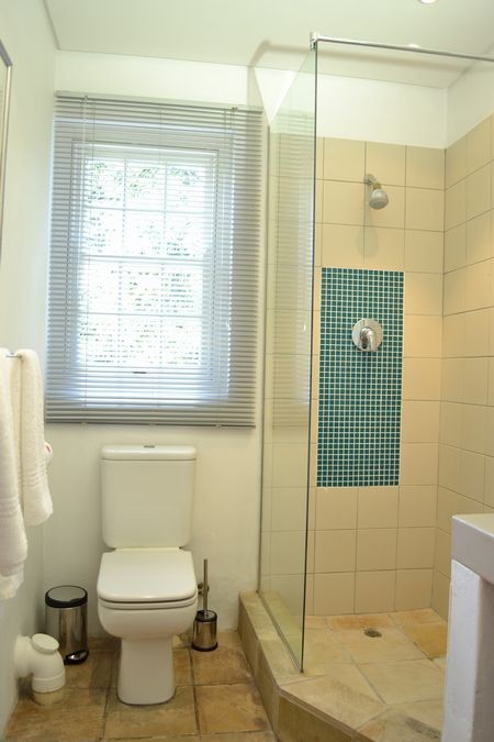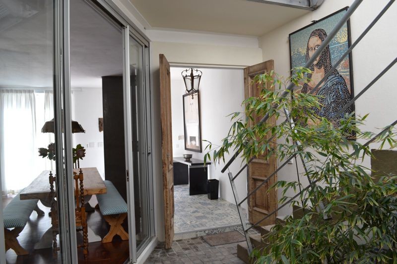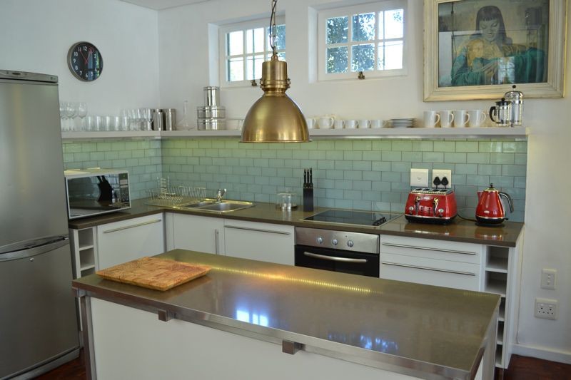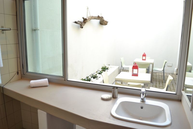 The metal stairs are open air with connecting balconies to the first floor bedrooms 1, 3 & then 2, with a further flight of open stairs to the roof terrace. The large master bedroom 1 stretches the width of the property with open plan shower and separate toilet. French Windows open onto a long balcony with seating area that over looks the courtyard below and has great views of the city and Table Mountain. Bedroom 3 is the middle room with en-suite bathroom and can be made up as king or twin. Located at the front of the house, bedroom 2 spans the width of the property with French Windows looking across the village. Like bedroom 1 this has an open plan bathroom with separate toilet.