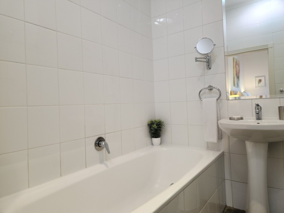 This luxury two bedroom property has an open plan living & dining area and kitchen with wooden floors and ornamental fireplace. The air-conditioned front queen sized bedroom with en-suite bathroom has a shower and a bath whilst the second air-conditioned queen bedroom has an en-suite with shower; doors from the bedroom open directly out onto the private pool terrace area. This area with shaded table and seating looks across the solar heated pool and a spiral staircase leads you up to a roof deck with sun-lounges and spectacular views of Table Mountain, the City & the Waterfront.