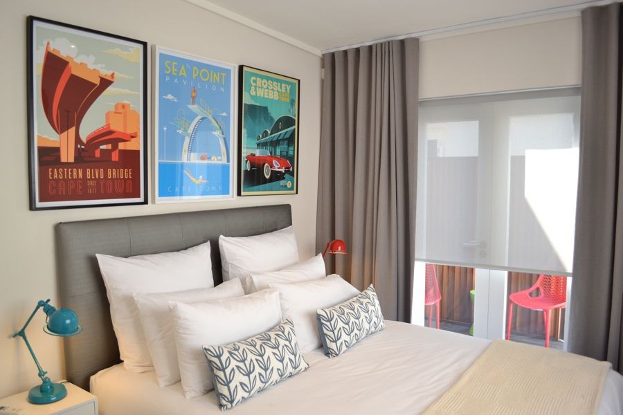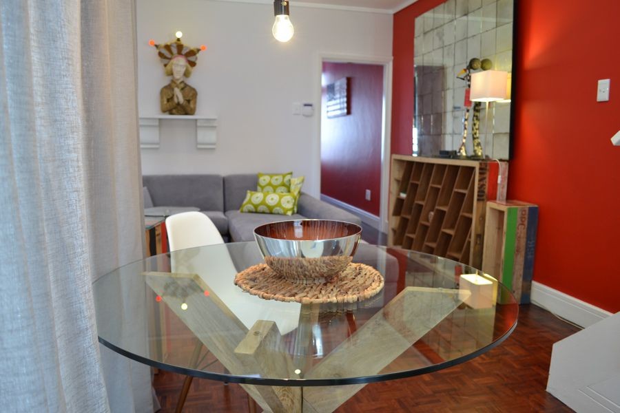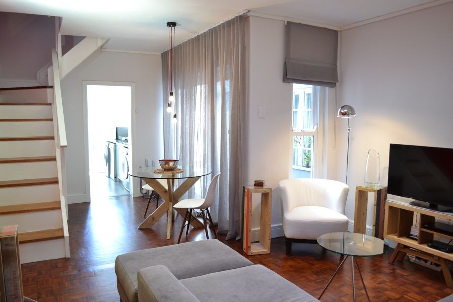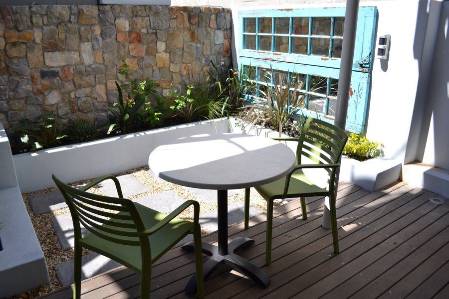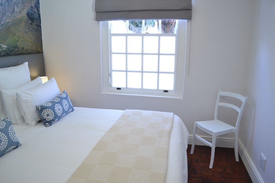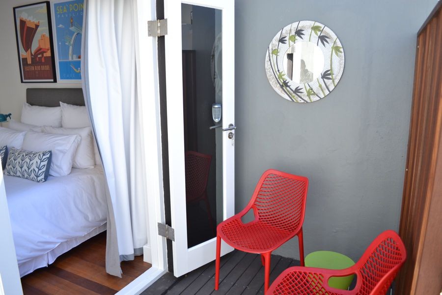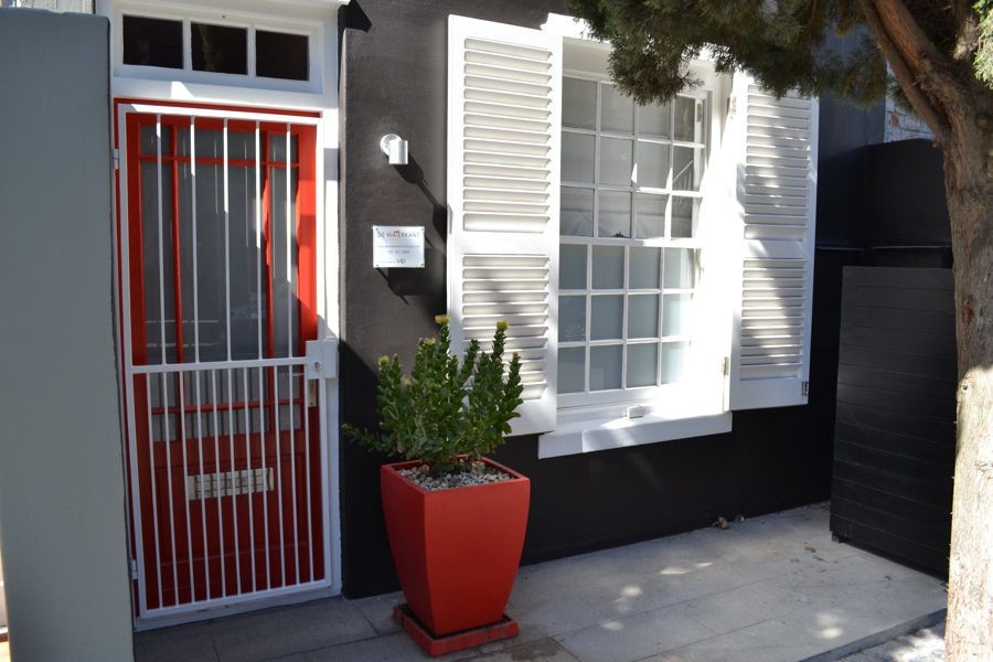 Located at the quieter end of Loader Street and tastefully designed this home is ideal for couples or small families with two air-conditioned bedrooms and one shared bathroom. The red entrance hallway passes the ground floor bedroom which has a Cape Town scenic view on wallpaper; this room can be made up as King or Twin. The bright open plan living and dining area has sliding glass doors that opens onto a wrap around court yard connecting the walled fountain garden. This area, with deck and seating, is also accessed from the fully fitted kitchen.