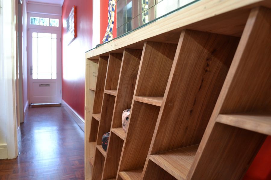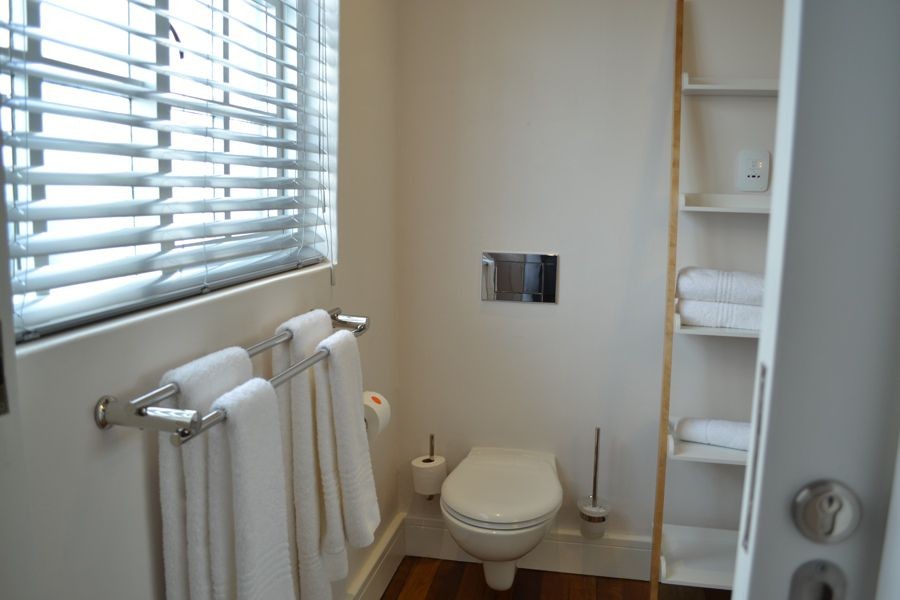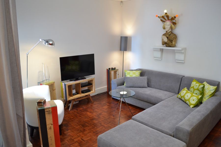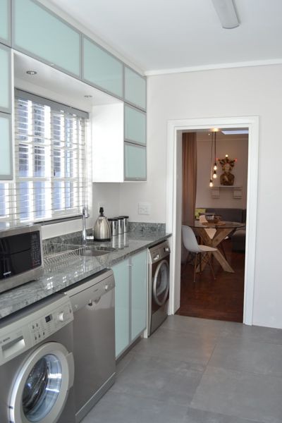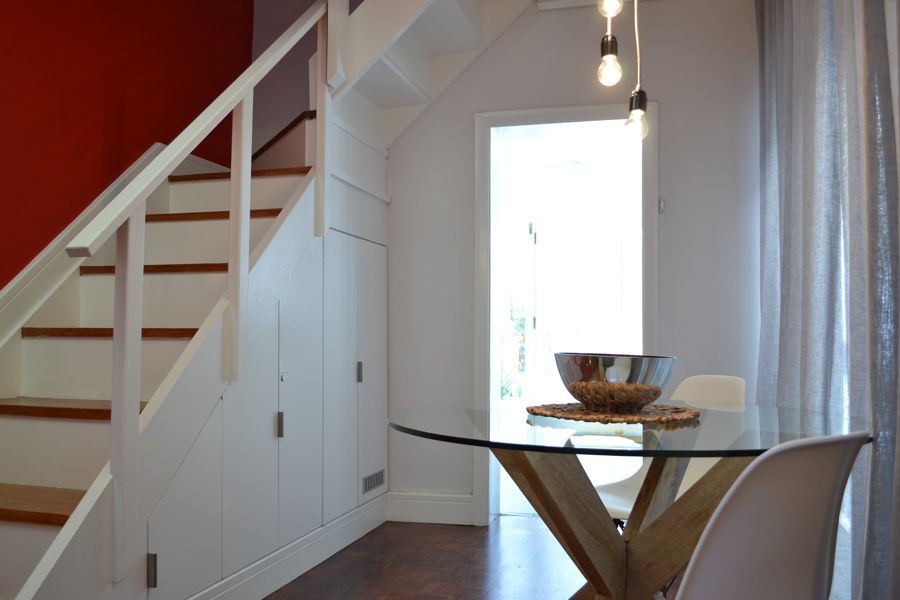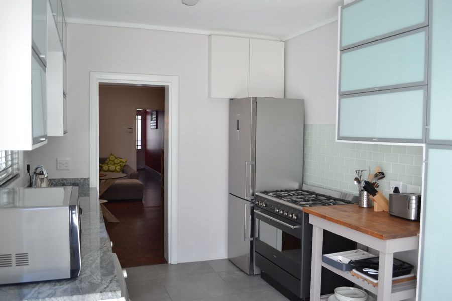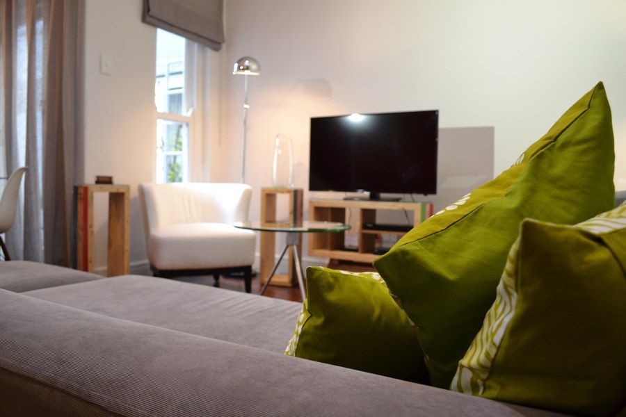 Located at the quieter end of Loader Street and tastefully designed this home is ideal for couples or small families with two air-conditioned bedrooms and one shared bathroom. The red entrance hallway passes the ground floor bedroom which has a Cape Town scenic view on wallpaper; this room can be made up as King or Twin. The bright open plan living and dining area has sliding glass doors that opens onto a wrap around court yard connecting the walled fountain garden. This area, with deck and seating, is also accessed from the fully fitted kitchen.