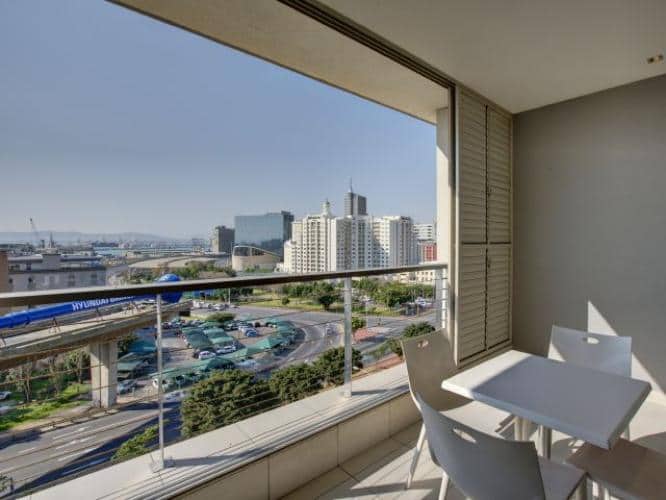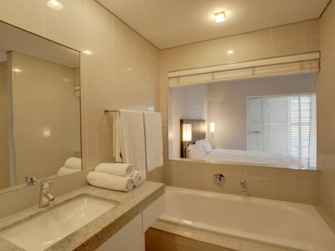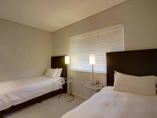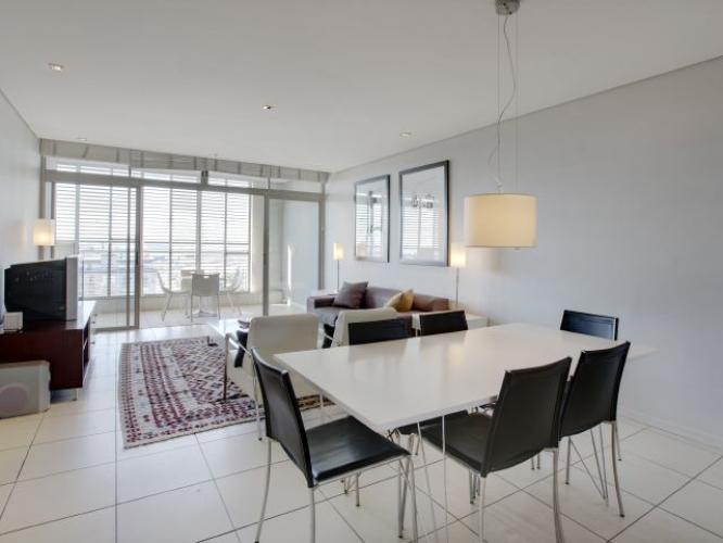 Exclusive, serviced apartment conveniently situated in close proximity to the Cape Town International Convention Centre as well as the V&A Waterfront. The apartment is elegantly furnished in a modern contemporary style. The apartment is fully equipped, air- conditioned and fitted with broadband Internet. There is a double bedroom with built in cupboards and en suite bathroom fitted with a bath and separate shower, a twin bedroom with en suite bathroom with a bath and separate shower, a guest toilet, fully fitted kitchen leading into open plan lounge / dining room. The apartment has a balcony that has great views over Cape Town.