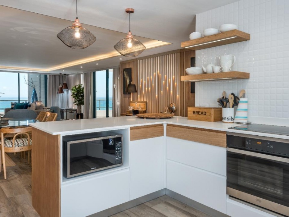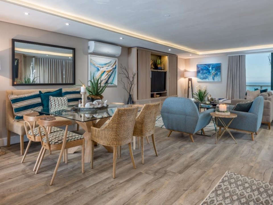 Step inside and you’ll find a spacious open-plan living, dining, and kitchen area with air-conditioning and plenty of natural light. The lounge offers plush seating for slow mornings and movie nights, while the dining table seats six for easy shared meals. Two balconies extend the living space outdoors — one set up for alfresco dining and a gas braai, the other perfect for sundowners with the sea as your backdrop.
