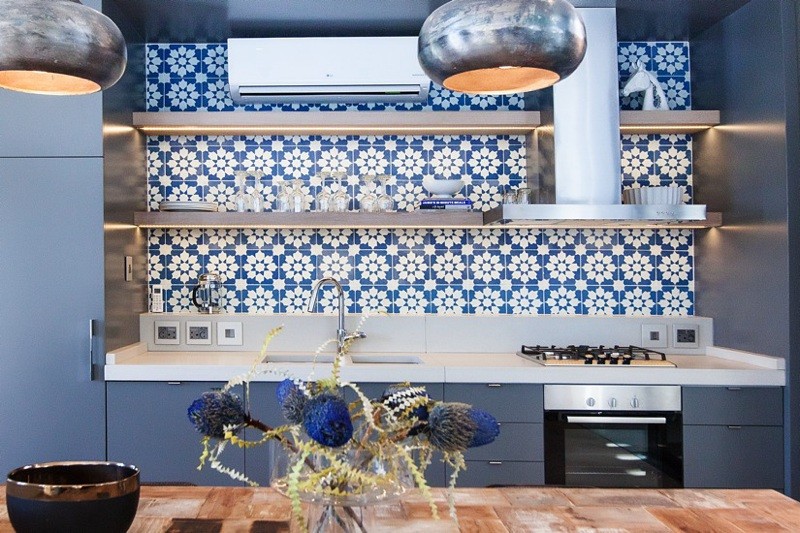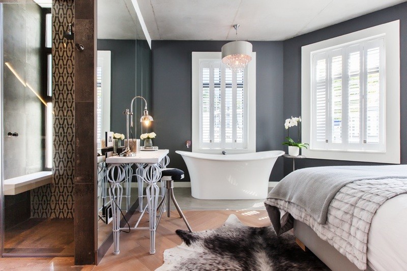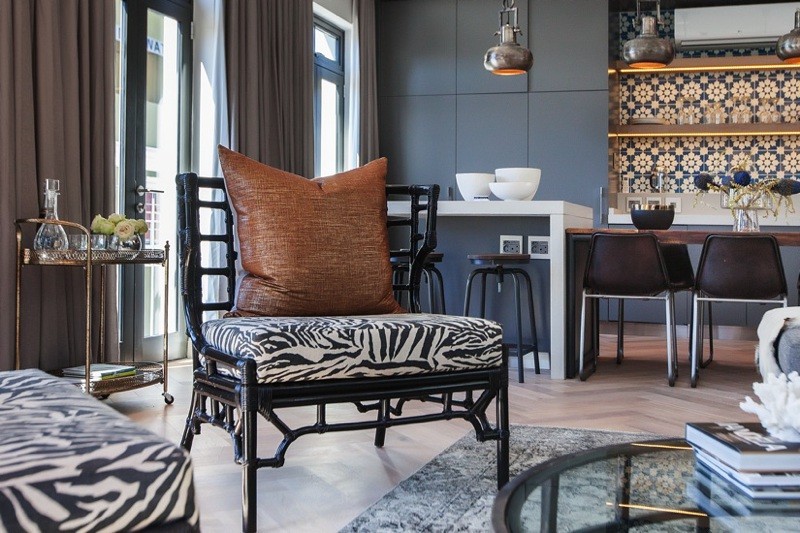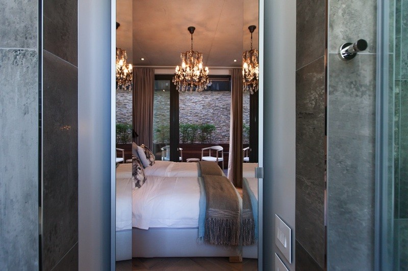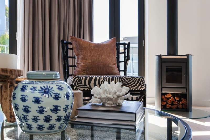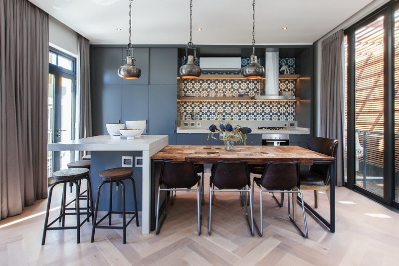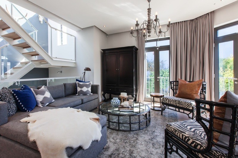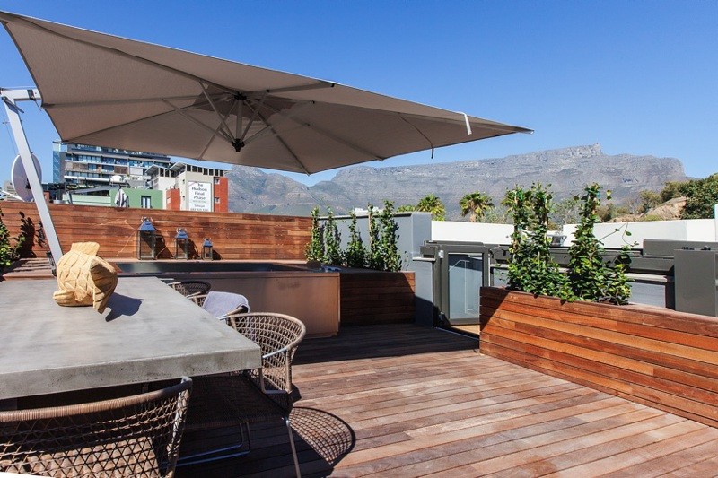 A raised bar counter with attached wooden dining table divides the fully fitted luxury kitchen from the living room. This space enjoys a massive L-shaped sofa and wood burning stove. White metal stairs with sliding glass skylight lead you to the wooden roof deck; here the area boasts seating, braai, sink with under-counter fridge and purpose built stainless steel hot tub all with spectacular views of Table Mountain and the city.