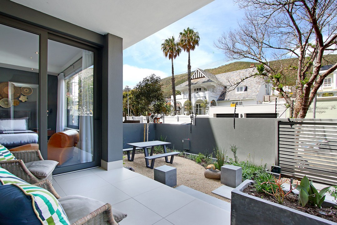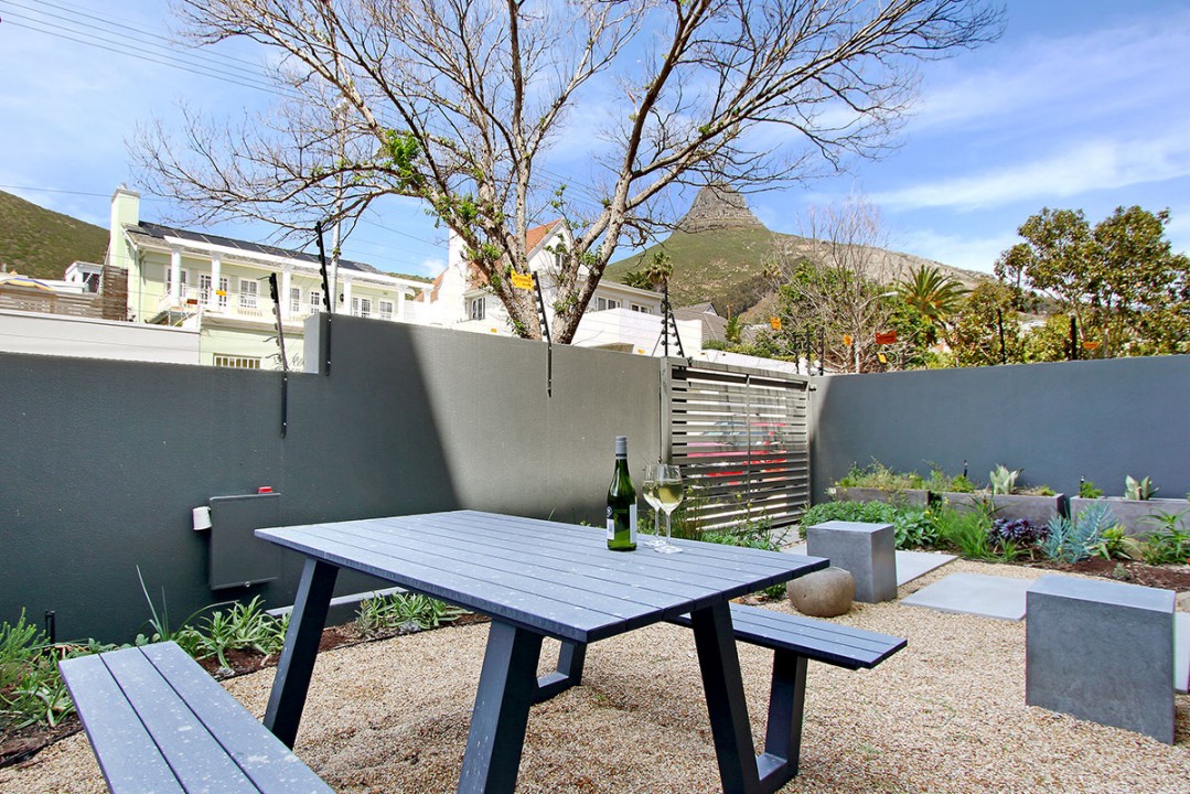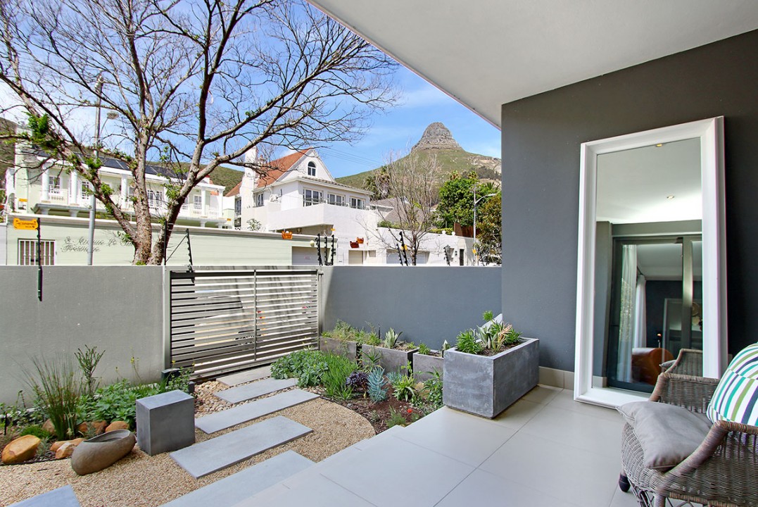 The two-bedroom apartment is situated on the ground floor of the block and has a lovely patio garden with an outdoor dining table and views of Lion’s Head. The three-bedroom apartment is found on the top floor of the block and has a covered balcony with lounge chairs and a table and an upper viewing deck with a gas braai, prep basin, lounge chairs, and an eight-seater dining table for outdoor dining and entertainment.
