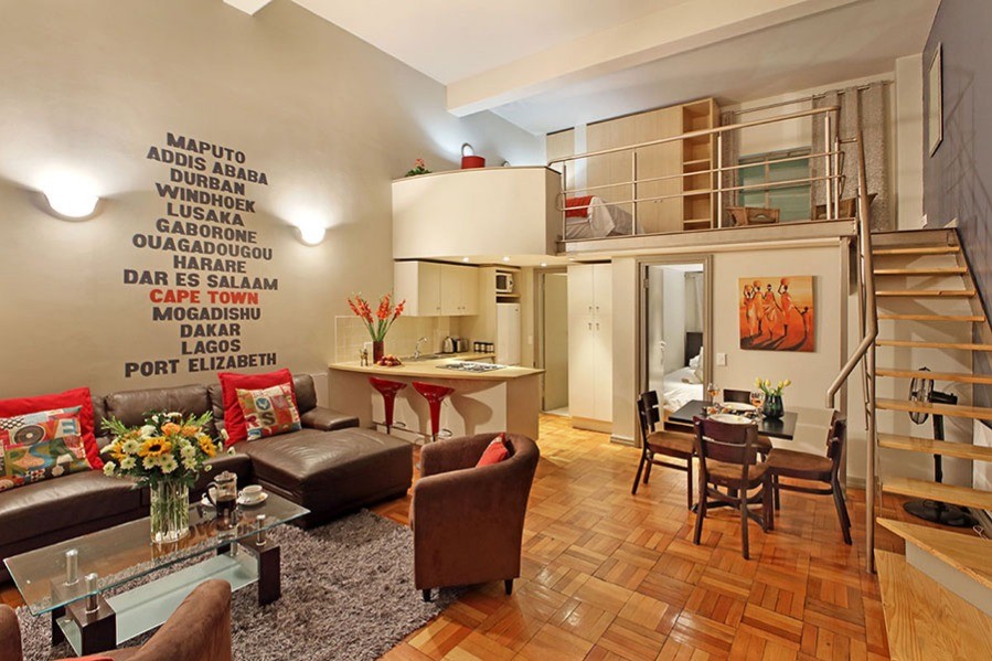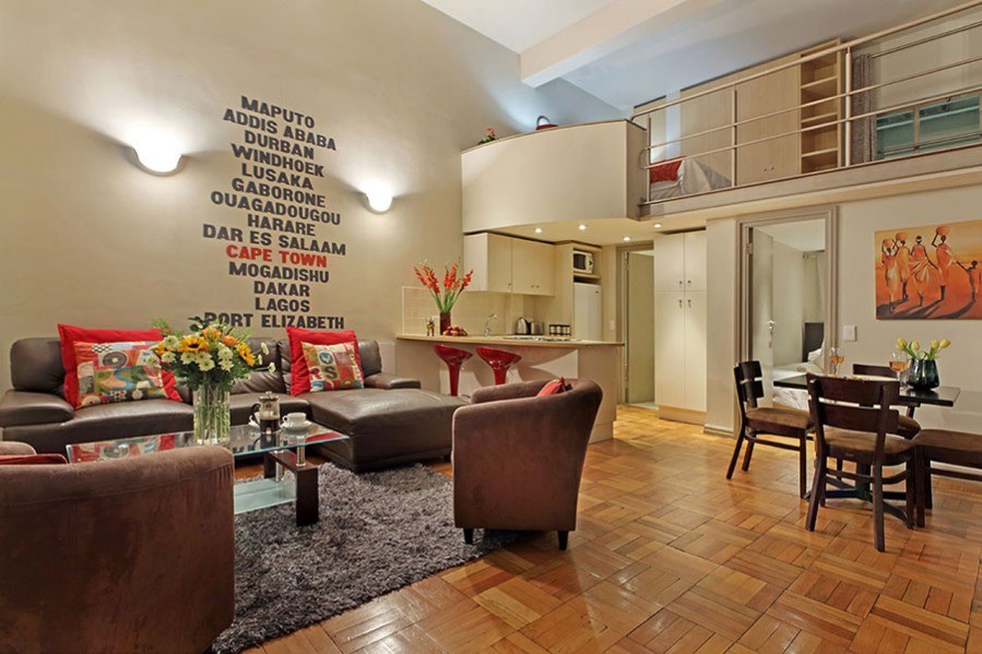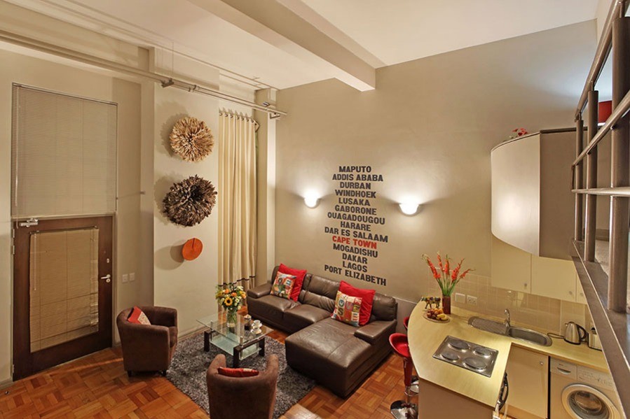 Afrinest two-bedroom Cape Town city apartment is inspired by Africa; not the Africa of khaki and neutrals but rather of vibrant reds, blues and oranges.