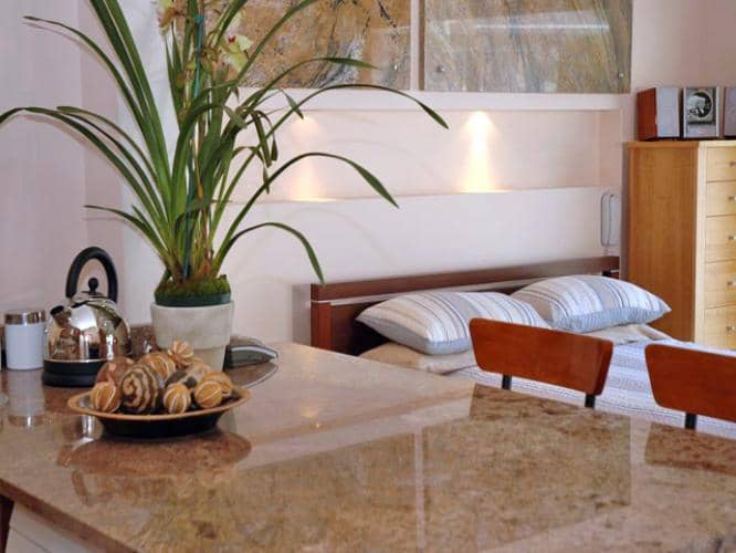 The balcony is accessible from the bedroom area, and has a table and chairs for al fresco dining while enjoying the majestic vista armed with a glass of one of the Cape’s award winning wines. Adjacent to the bedroom, stools provide a place at the kitchen counter for breakfast or snacks with friends.