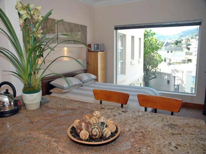 This cosy, open-plan bachelor’s pad sleeps a couple in comfort, and is the perfect place for either a long-term lease or a short stay. Its intimate, private balcony affords a panoramic and awe-inspiring view of Table Mountain’s craggy magnificence, from Devil’s Peak to all twelve of the Twelve Apostles. It’s the place to be on those special afternoons when the ‘table cloth’ pours off the plateaux in a river of mist.