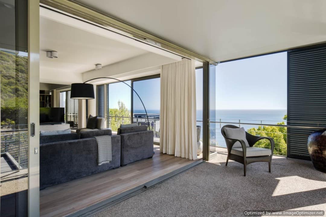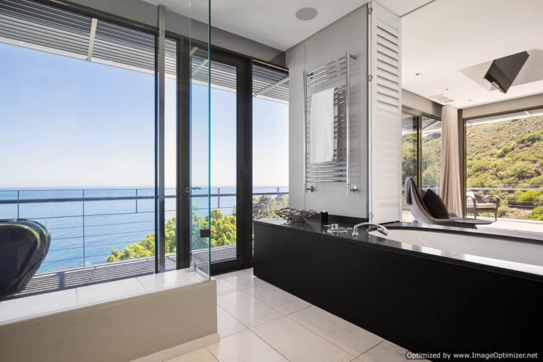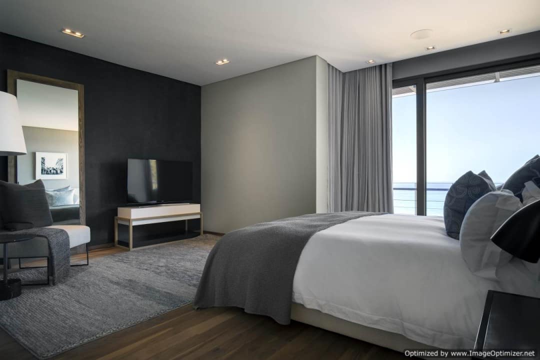 3rd-floor, sea-facing king sized bed with walk in closet, air conditioning, balcony access from room and bathroom. Open planned ensuite, double basin, bath, shower and heated towel rails TV with sea and mountain views.