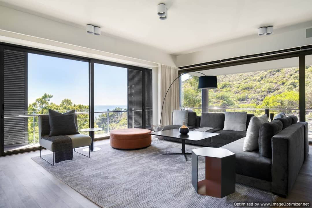 On the ground level there is a superb lounge area which leads onto the swimming pool and bar facilities. The bar includes an ice machine, making it perfect for entertaining. The fourth bedroom is also situated on this level, as well as the incredible wine cellar. The kitchen and living areas are found on the second floor and open up onto a wrap-around balcony, which provides the ideal location to take in the superb mountain and partial sea views, which are only obscured by beautiful greenery, making the villa even more private.