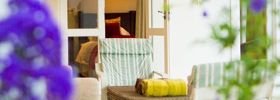 This sunny room offers a haven on the Garden Route for guests with great natural light. Two extra-length beds with crisp white linen sheets ensure a comfortable night’s sleep. Visitors staying in this room at the Apple and Spice Guesthouse can enjoy a bath or a shower in the en-suite bathroom. There is easy access to the pool with doors opening on the lower patio; just the place to relax on a hot summers day. Offering guests fantastic views of George’s famous Fancourt golf estate as well as the surrounding mountains. The room is equipped with the standard high class amenities; tea and coffee facilities, fresh towels daily, hairdryer; as well as a wall heater.