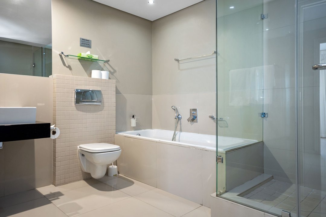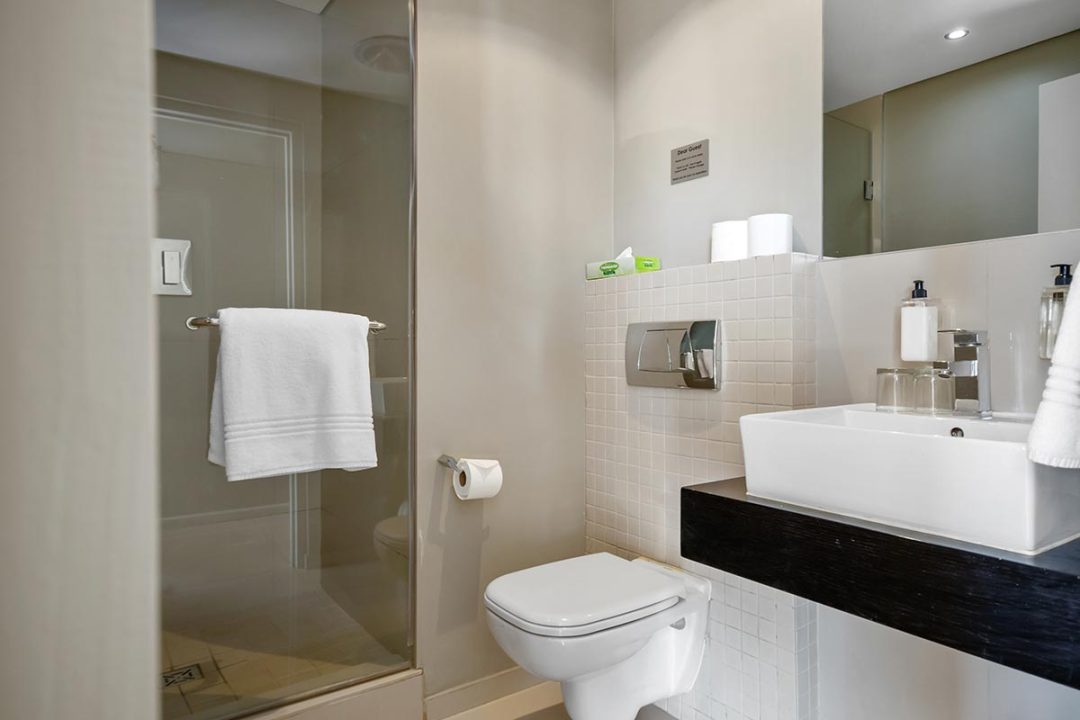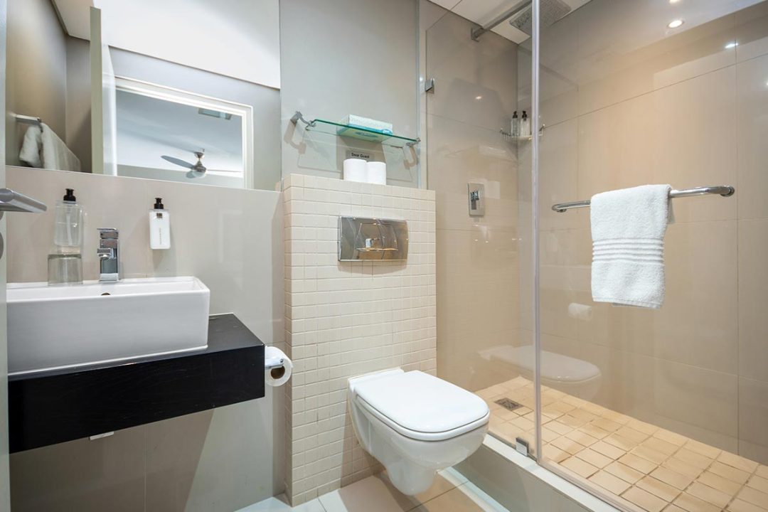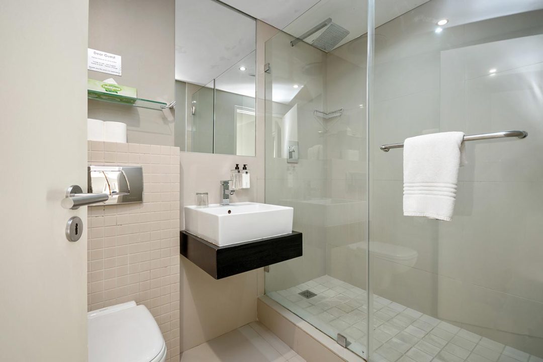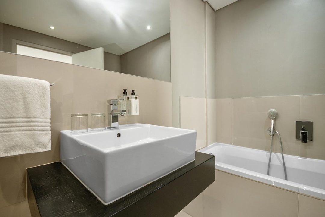 Enjoy a good night’s rest after a busy day of work or play in your elegantly furnished bedroom with a quality double bed, luxury linens, and spacious en suite bathroom with contemporary finishes. All suites are fully air-conditioned and serviced every day, and include a flat screen TV, free Wi-Fi, and come with secure parking