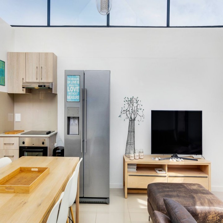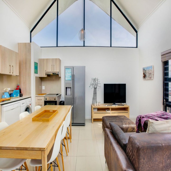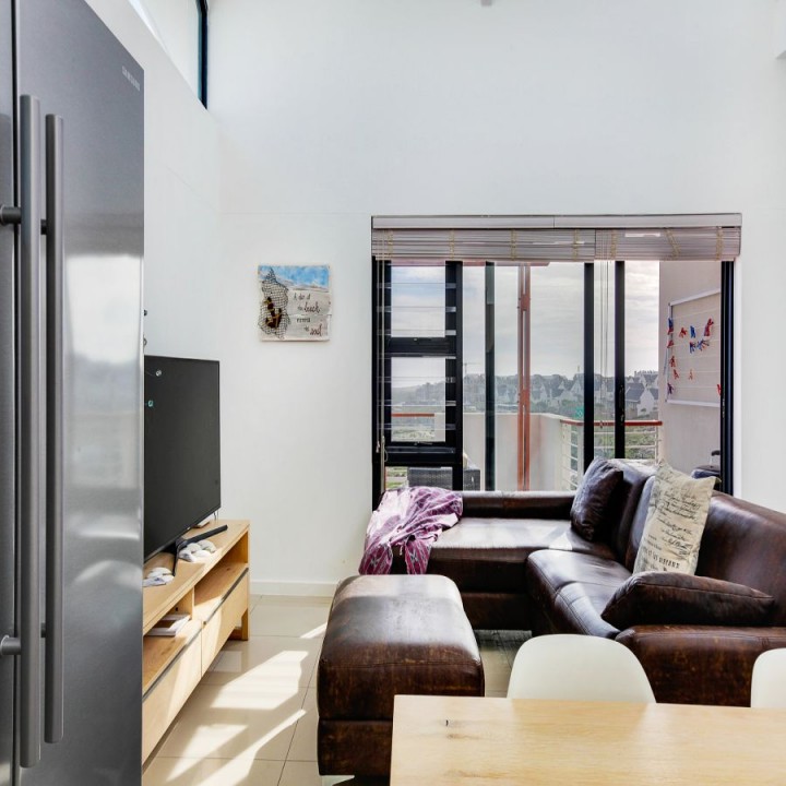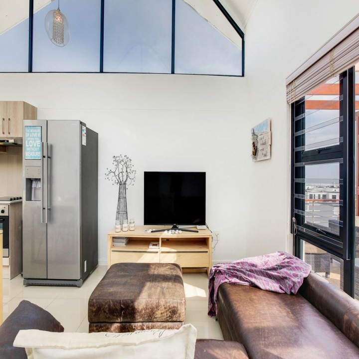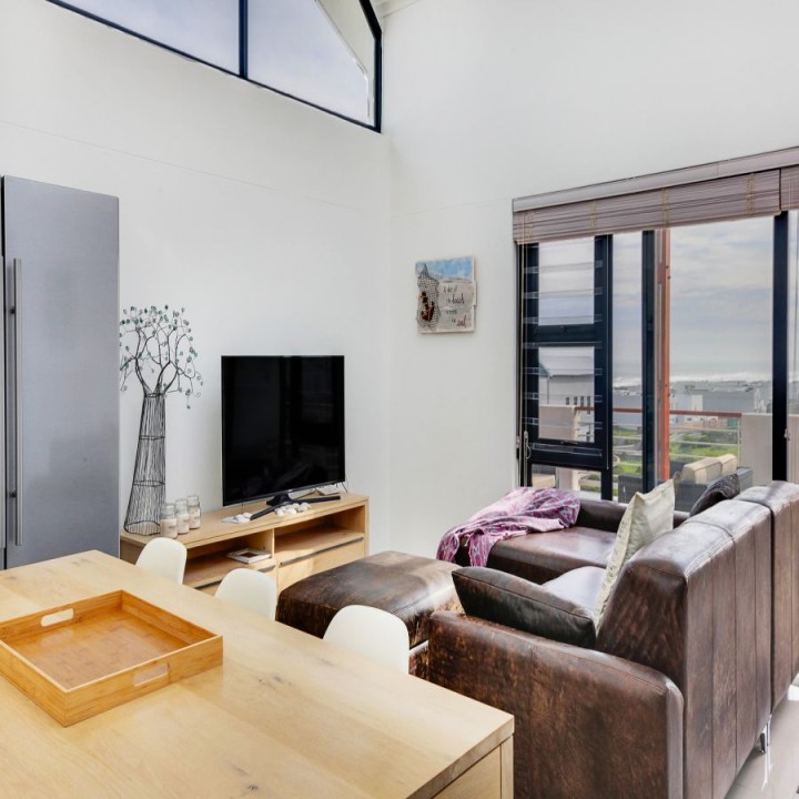 The lounge has a sliding glass door that leads out to a terrace, which overlooks the complex and the distant Atlantic Ocean and Robben Island.