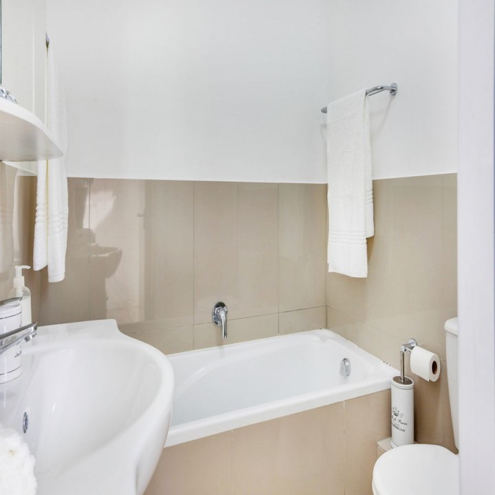 The main bedroom is equipped with a king-size bed and built-in cupboards, and the second room has 2 single beds. Both rooms have wooden floors and share the bathroom, which has a bath and separate shower.