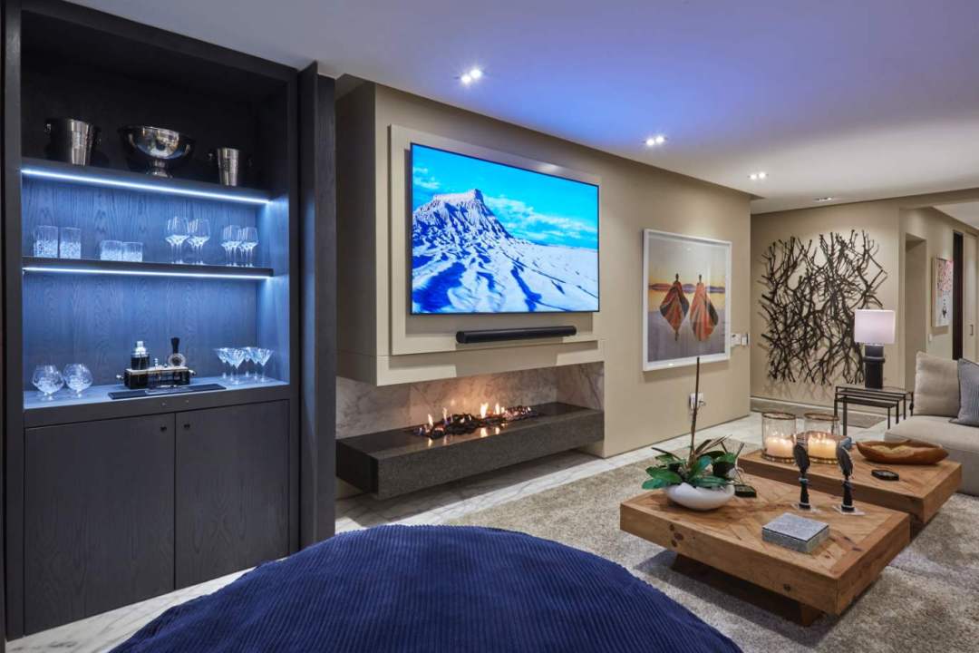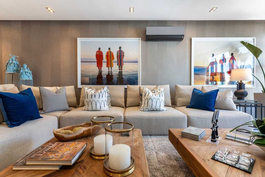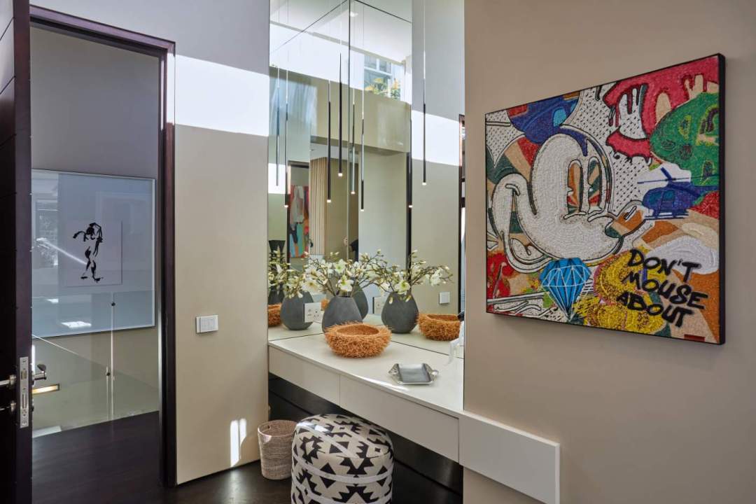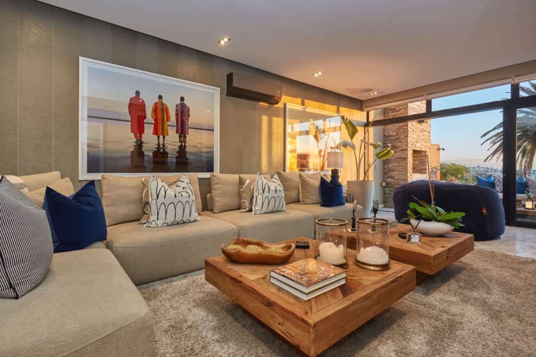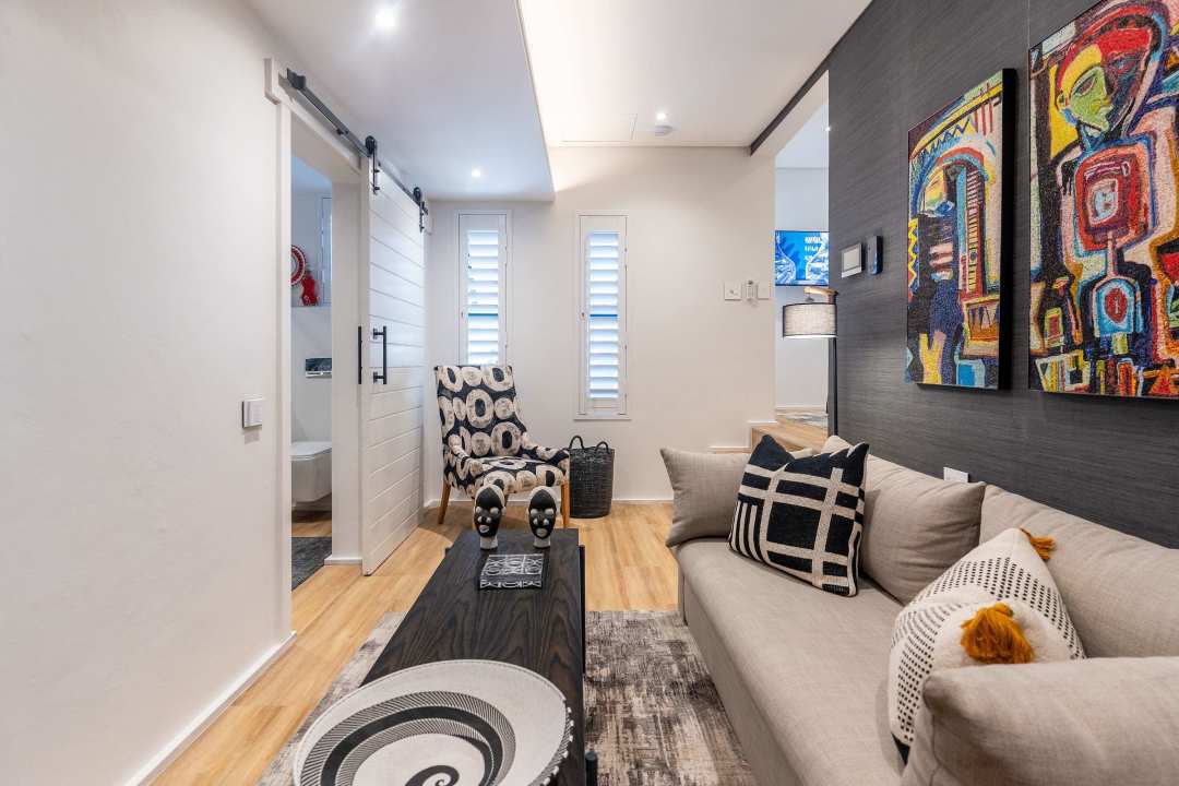 The second level is designed for fun, comfort, and connection. It’s the heart of the villa’s entertainment space, where you can kick back and enjoy everything the home has to offer. The informal lounge is cozy and welcoming, with colourful artwork, soft seating, and a large-screen TV – perfect for movie nights or lazy afternoons.