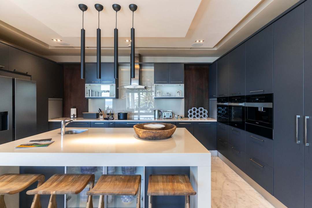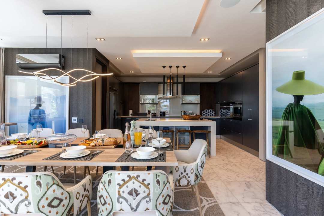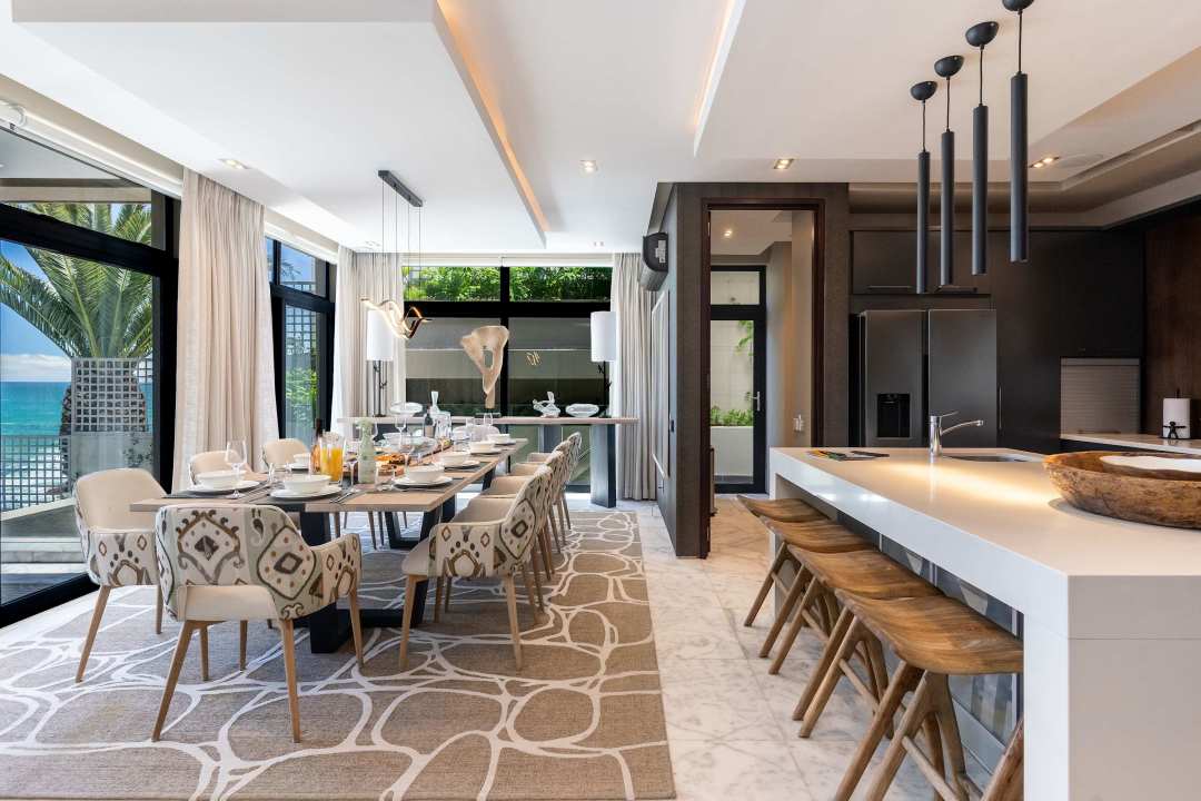 The open-plan dining area is ideal for hosting meals, whether it’s a casual breakfast or a more formal dinner. The gourmet kitchen is fully equipped with top-of-the-line appliances, sleek countertops, and everything you need to prepare meals with ease. It flows seamlessly into the dining and lounge areas, making it easy to stay connected with guests while cooking.