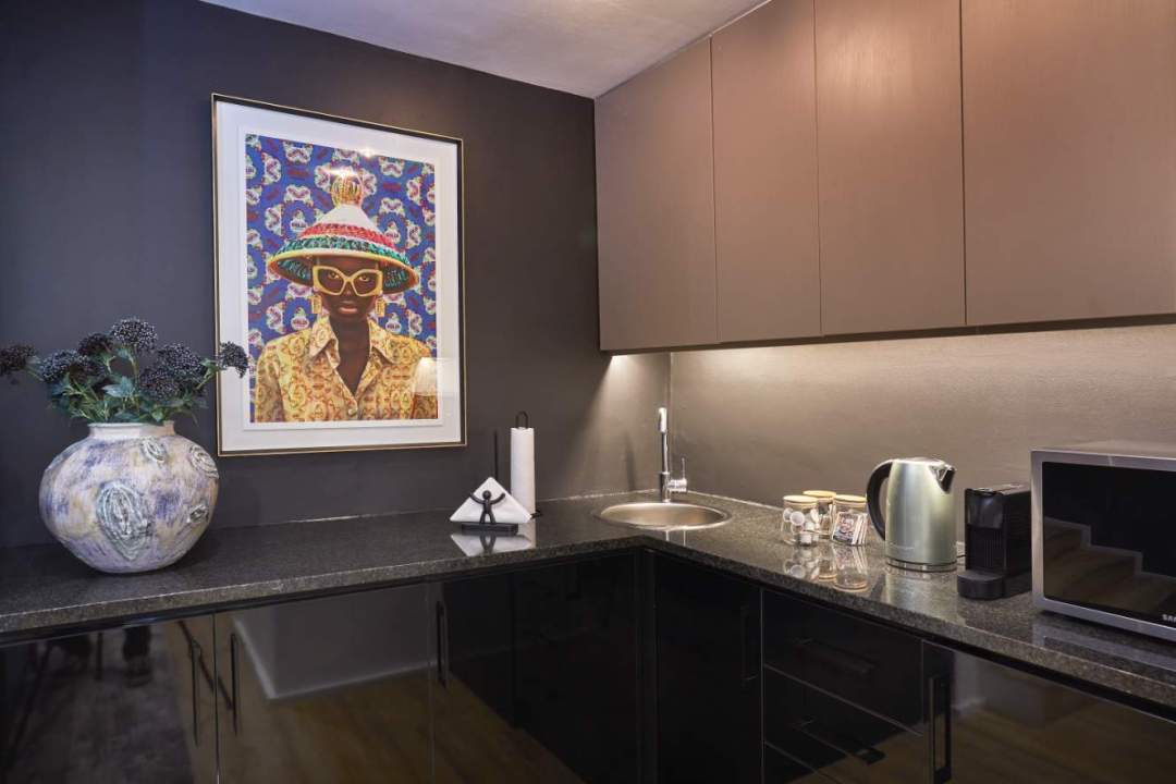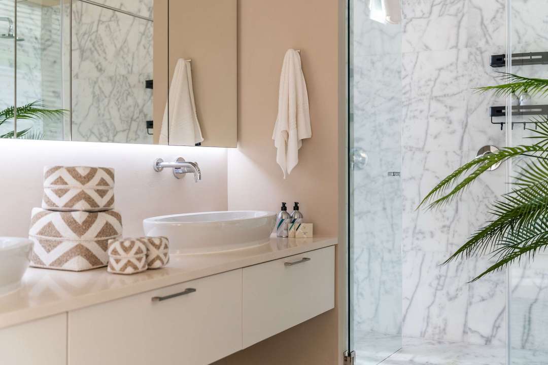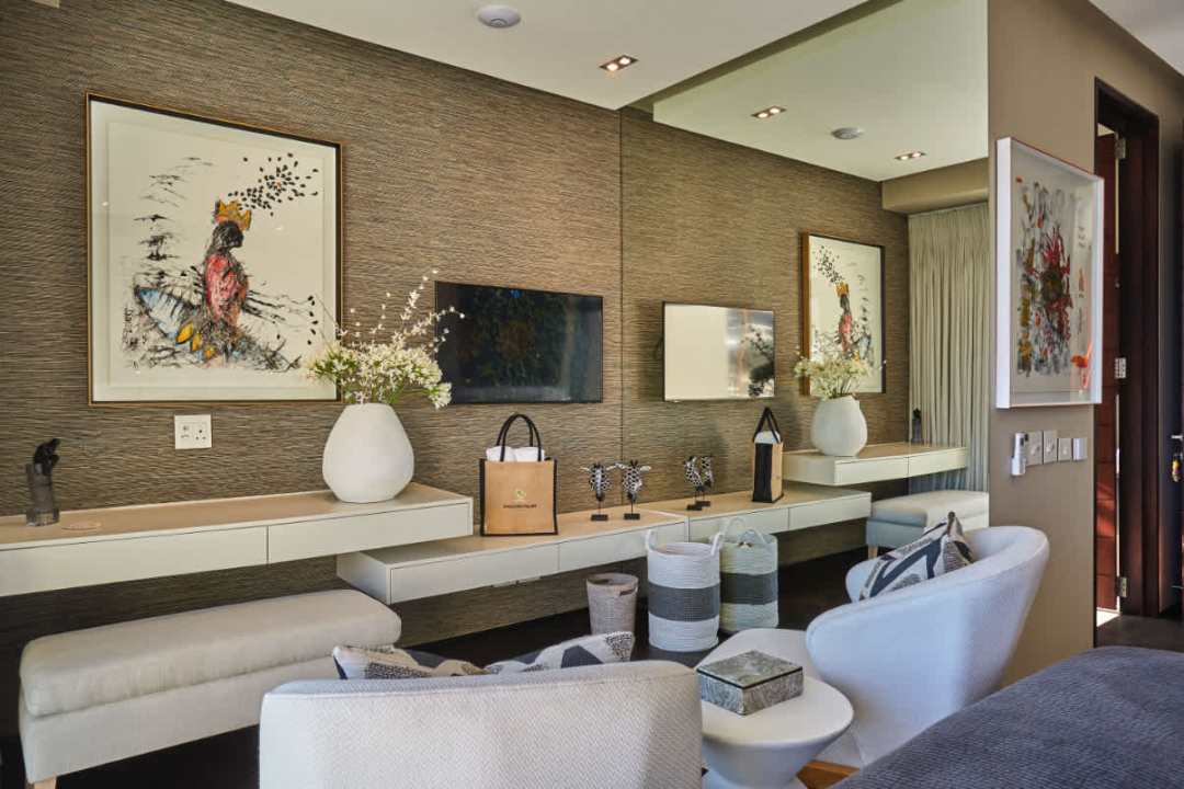 Unlike the other four bedrooms in the villa, The Pad is more modest in style and finish. The gorgeous private suite is perfect for guests wanting their own space but it doesn’t offer ocean or mountain views, or access to private terraces. Making it best suited for an unfussed guest or support staff member who may be accompanying you. It provides a functional and private space that includes a small lounge area, a compact kitchenette, a comfortable bedroom with a flat-screen TV, and a private en-suite bathroom.