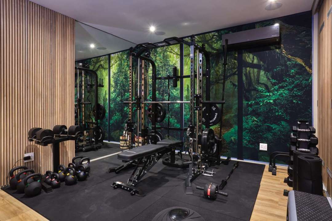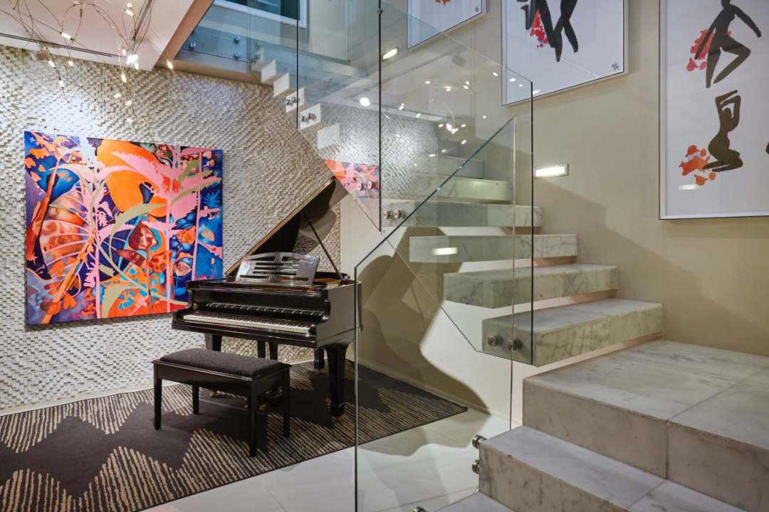 From this level, guests can also access the villa’s grand entrance – a striking foyer featuring a baby grand piano, curated artwork, and elegant lighting. A fully equipped gym is also located on this floor, along with a private elevator that connects all four levels of the home, ensuring easy access throughout the villa.
