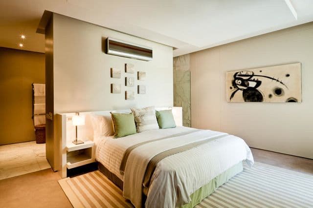 The interiors are a beautiful mixture of the modern and the natural, combining textures ranging from dark wood floors to an impressive white marble staircase with a palette of calming hues -blues, whites and beiges that compliment the magnificent outlook of the sea and mountains.