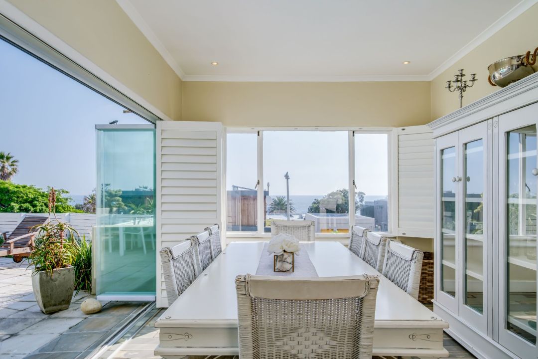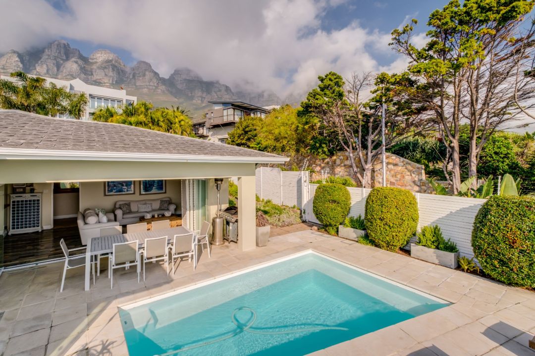 The spacious pool deck forms the heart of the home’s leisure lifestyle. Enjoy mountain views and partial sea views from the swimming pool, sun loungers, and eight-seater outdoor dining table — perfect for relaxed breakfasts, long lunches, and sunset drinks after a day exploring Camps Bay.