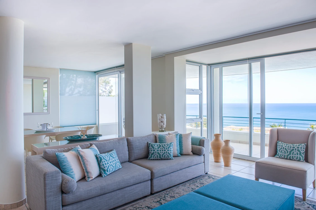 Spacious living & dining area with an 8-seater dining table, all leading onto an ocean-facing balcony