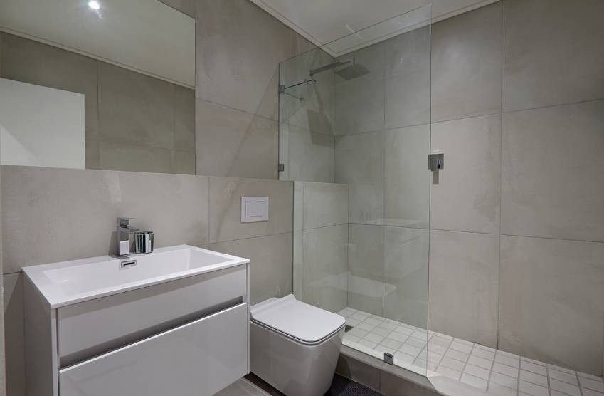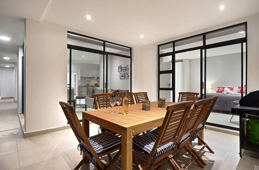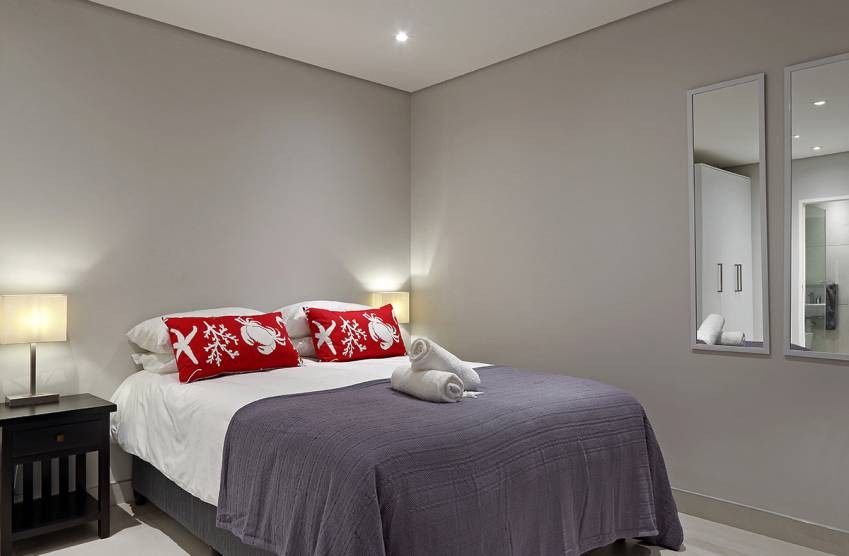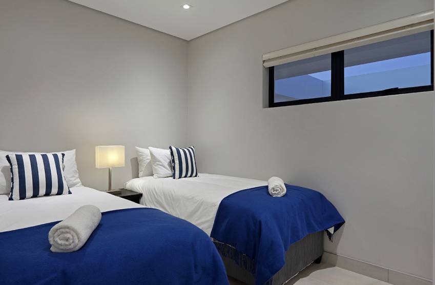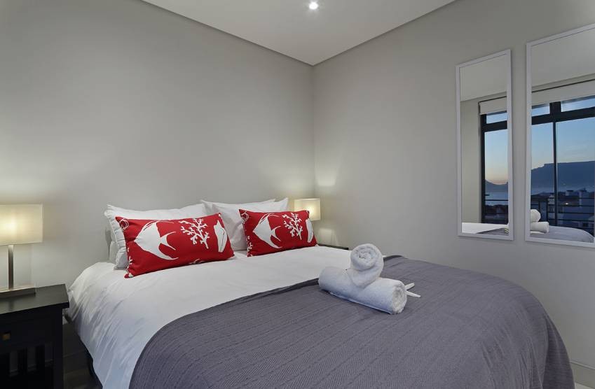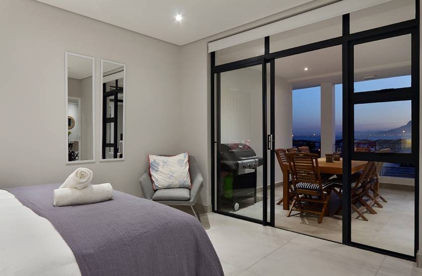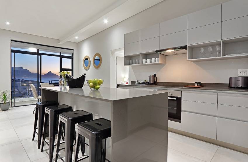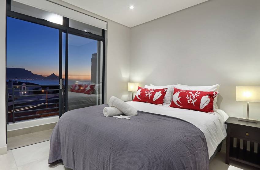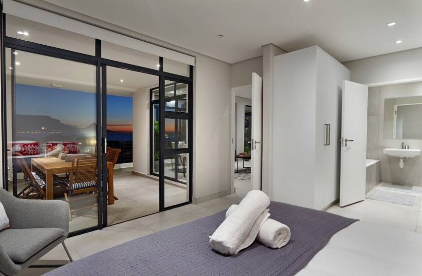 Modern open plan living areas greet guests as they enter this stunning penthouse apartment, with breathtaking ocean and Table Mountain views visible from the lounge, balcony and main bedroom. The kitchen is sleek and stylish, equipped with a range of essential appliances that include a dishwasher and washing machine. The breakfast nook is ideal for breakfasts and a fresh cup of coffee in the morning, while guests can also choose to dine at the more formal indoor dining table or else take in the incredible views by dining on the balcony. All three bedrooms boast a crisp, modernist decor style and are furnished with comfortable beds.