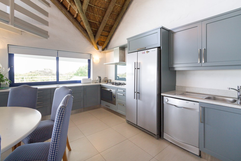 The beach home features a large, open plan kitchen with beautiful views of the sea, and large sliding doors leading straight onto the garden and pool area. The kitchen is fully equipped, with blue sparkling caesarstone surfaces, and new appliances. The thatched ceilings in the kitchen are double volume, with designer window features creating wonderful ambience and sunlight. Staircase leading from kitchen to the upstairs lounge.