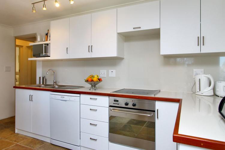 Fully equipped kitchen with a dishwasher and a separate outdoor laundry with washing machine and tumble dryer.