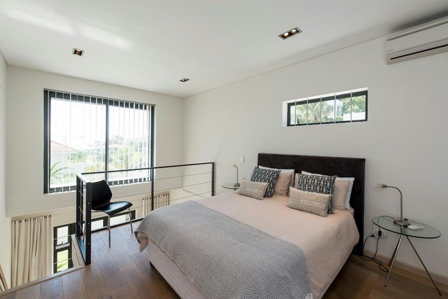 A large main bedroom en suite upstairs, 2 bedrooms with a bedroom en suite mezzanine level, a single bedroom ensuite upstairs, a study and guest toilet.
