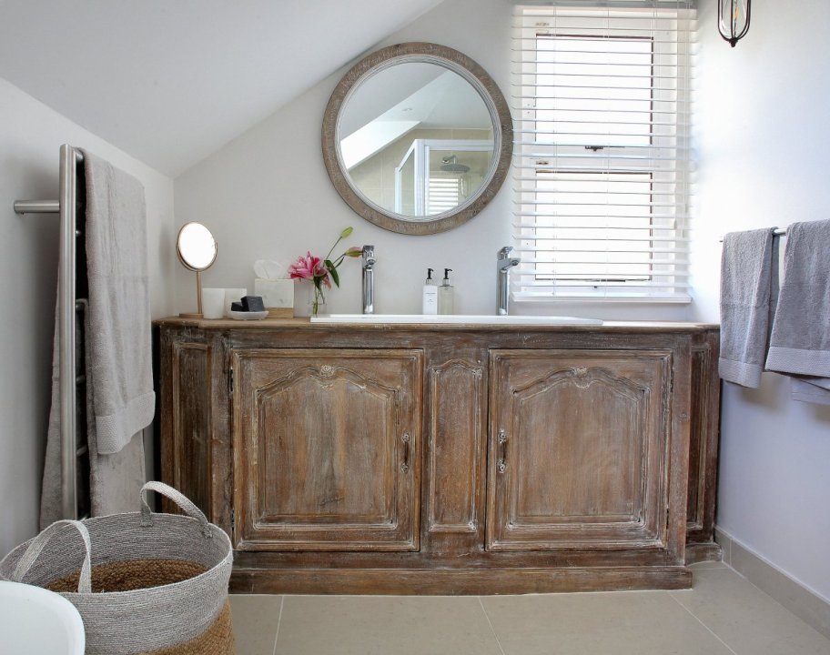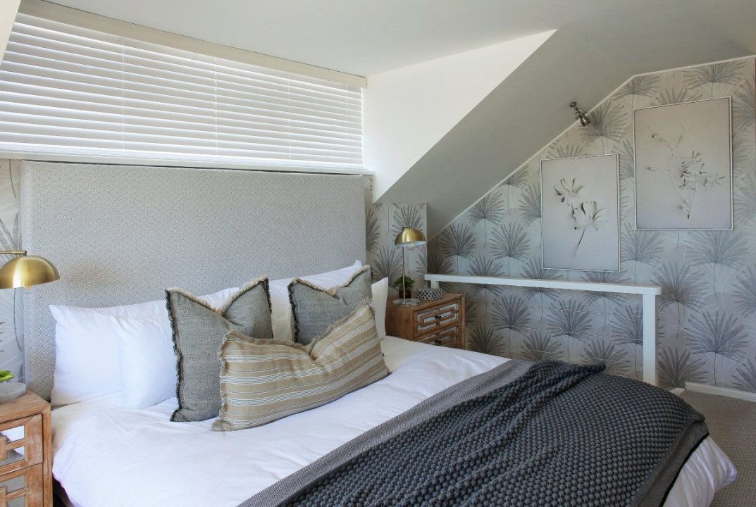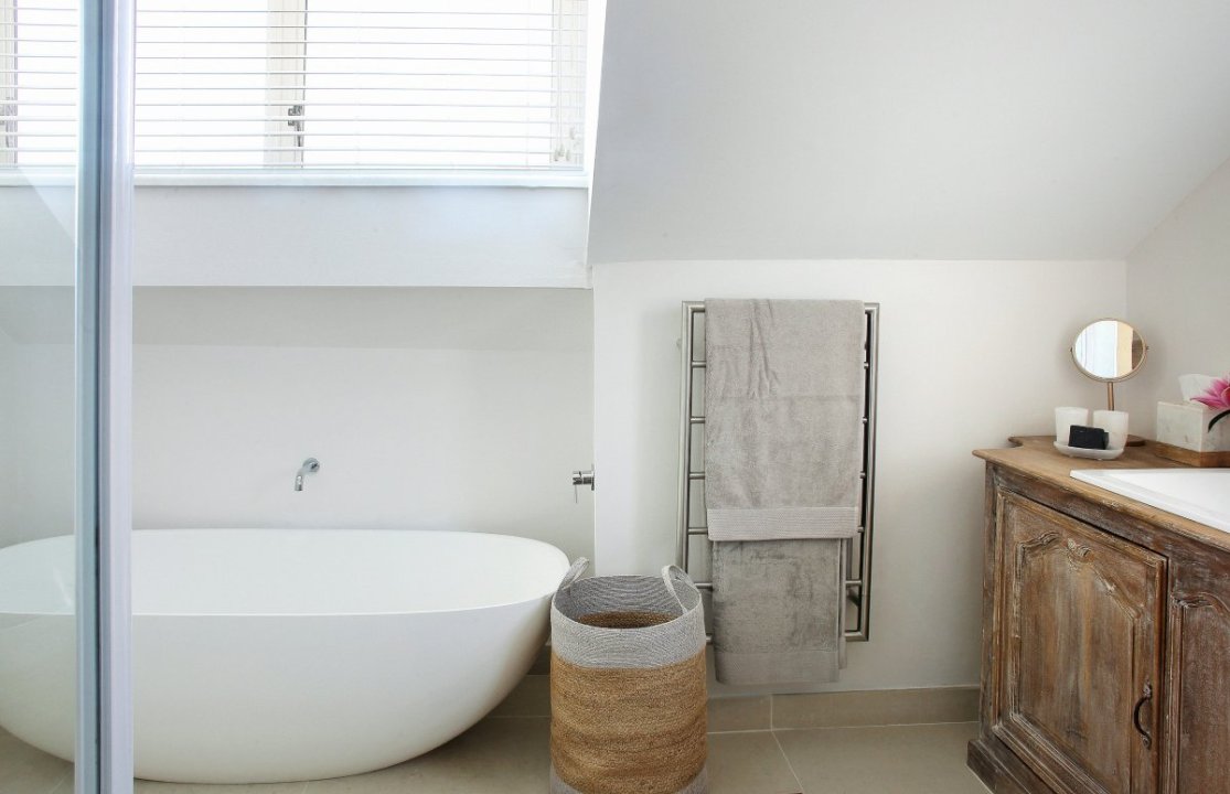Upstairs you will find the spacious loft-esque master bedroom complete with a King bed, plenty of cupboard space and a beautiful ensuite bathroom. The bathroom is fitted with a double vanity, a free-standing bath tub and a spacious walk-in shower.