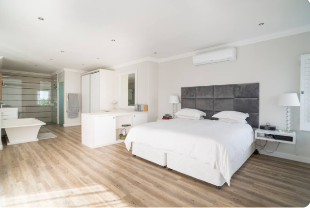 Downstairs you will have the open plan living area with two massive lounges on both sides of the kitchen with each a TV, a dining area for 8 people and a kitchen/ breakfast table for four. The kitchen itself is equipped with a gas stove, a nespresso machine, microwave, dishwasher, a separate wash kitchen with a washing machine and tumble dryer. Literally everything you need and more in top notch quality. In the Garden you have a patio lounge area with a build in typical South African Braai as well as your private pool and a trampoline.