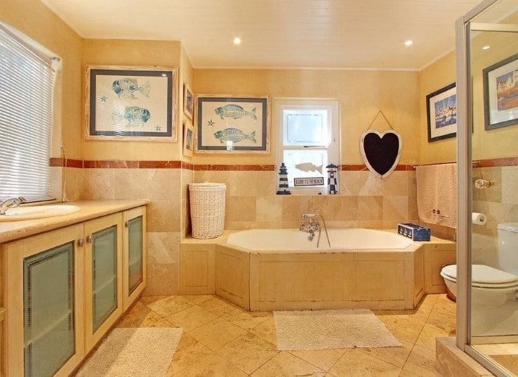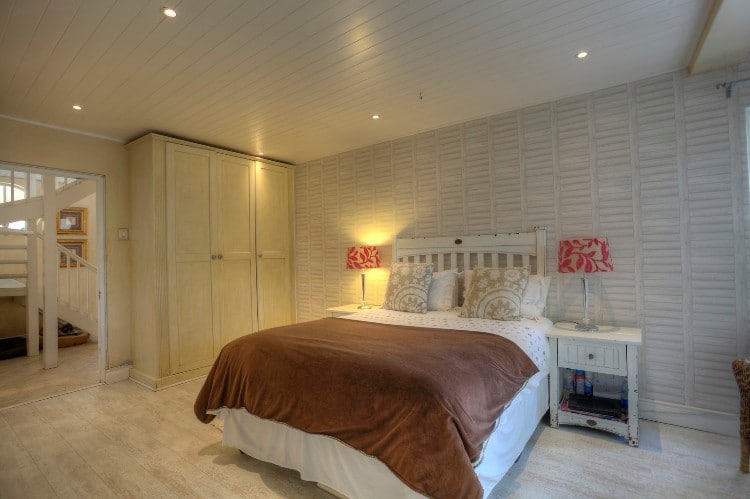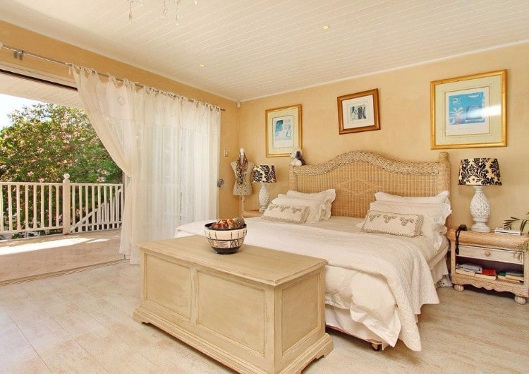On the ground floor are 3 luxury en-suite double bedrooms with Beachwood flooring leading to airy bathrooms with marble vanities and travertine floors. All are equipped with ample built in hand painted lattice cupboards. The 4th bedroom is an open plan studio flatlet with separate bathroom and leads onto the pool.