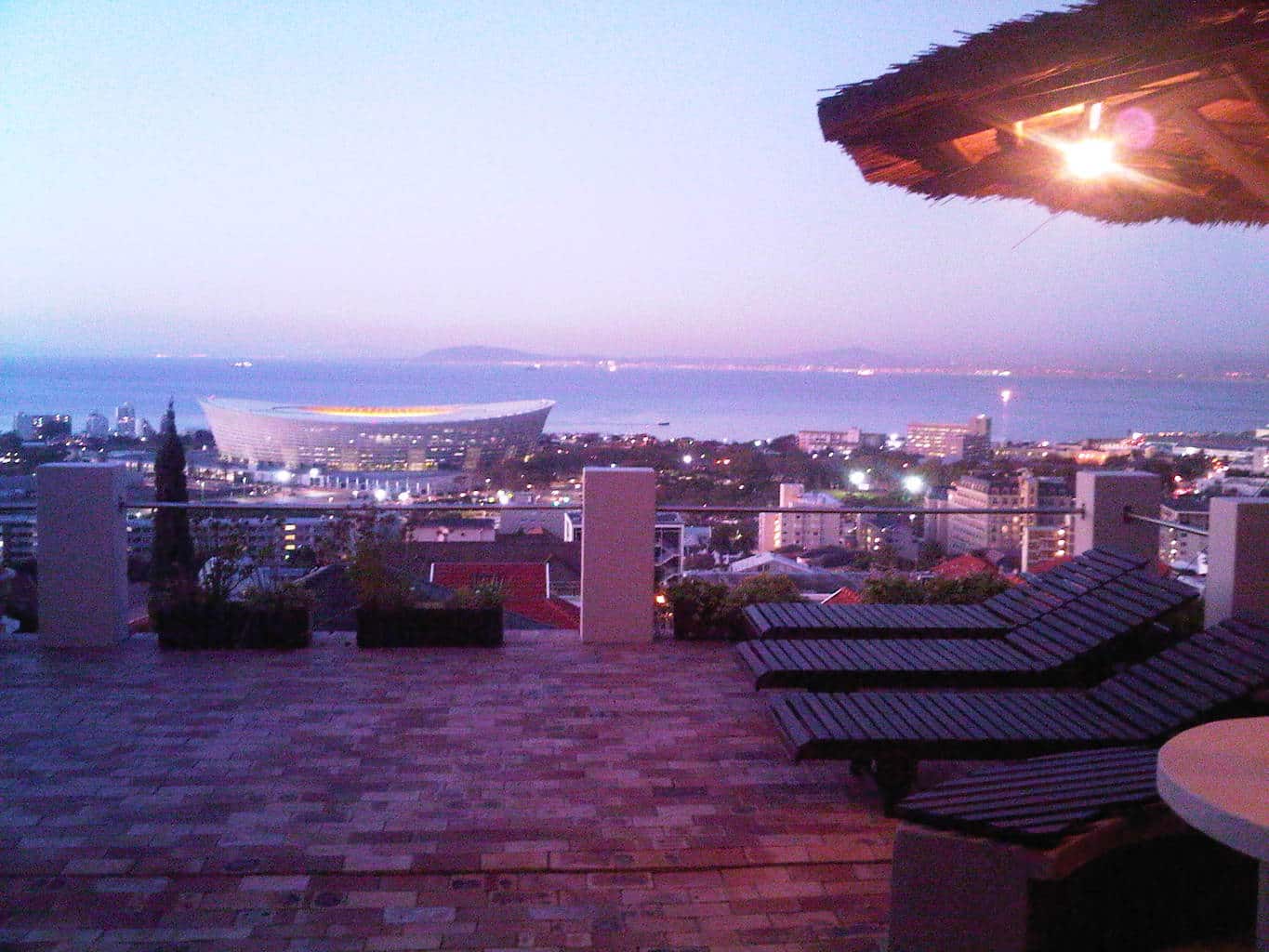 At Bluegum Hill Guest House you can enjoy a panoramic view of the suburbs below, over the rapidly growing new 2010 Stadium to Table Bay, with its busy harbour and the world-renowned V&A Waterfront. Towards your left you will see the coastal suburb of Mouille Point, with its Lighthouse and seaside promenade. On clear days you can see waves breaking on the shoreline of Robben Island, the historic prison where Nelson Mandela was incarcerated. Across the bay one sees Bloubergstrand, with the Tygerberg Hills in the background.