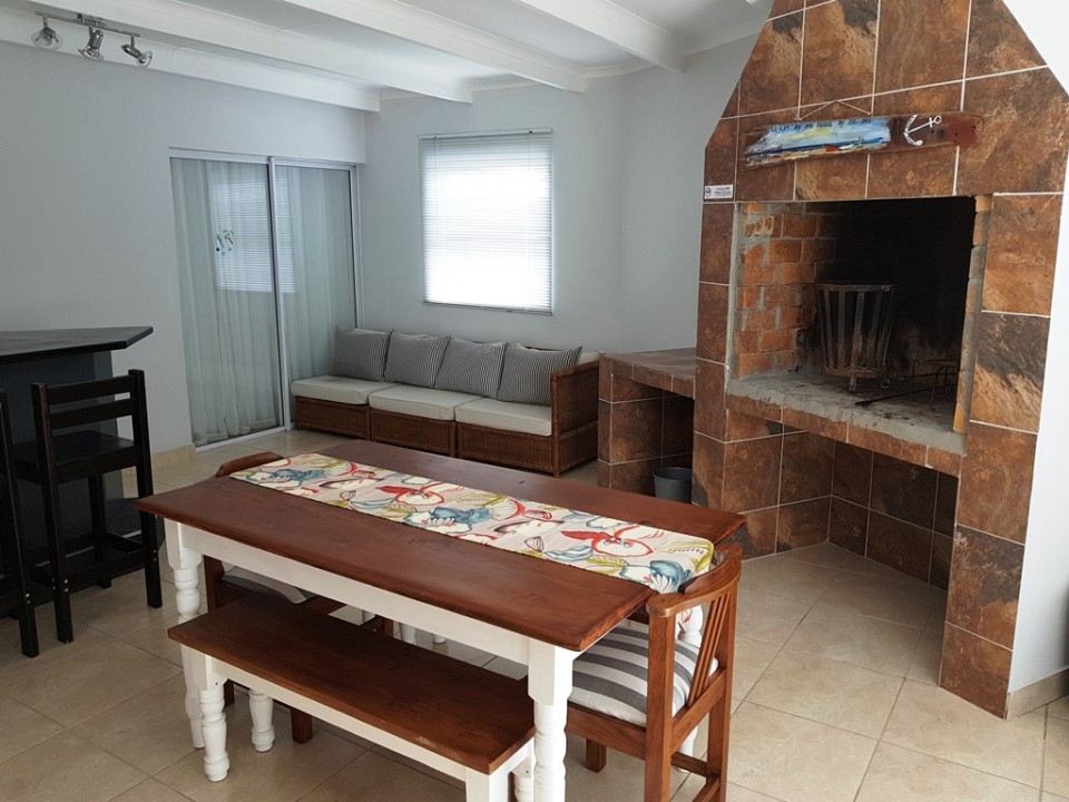The house has an open plan living area leading to a indoor braai area with built-in braai as well as a braai pit outside.