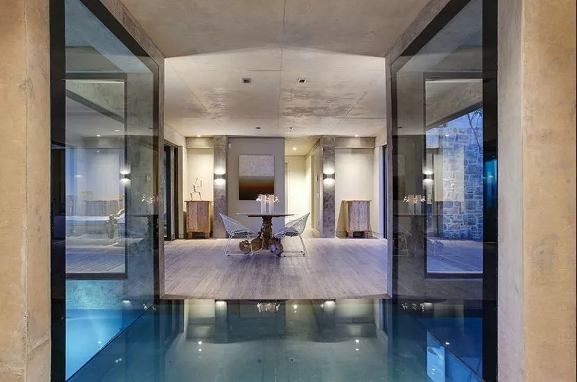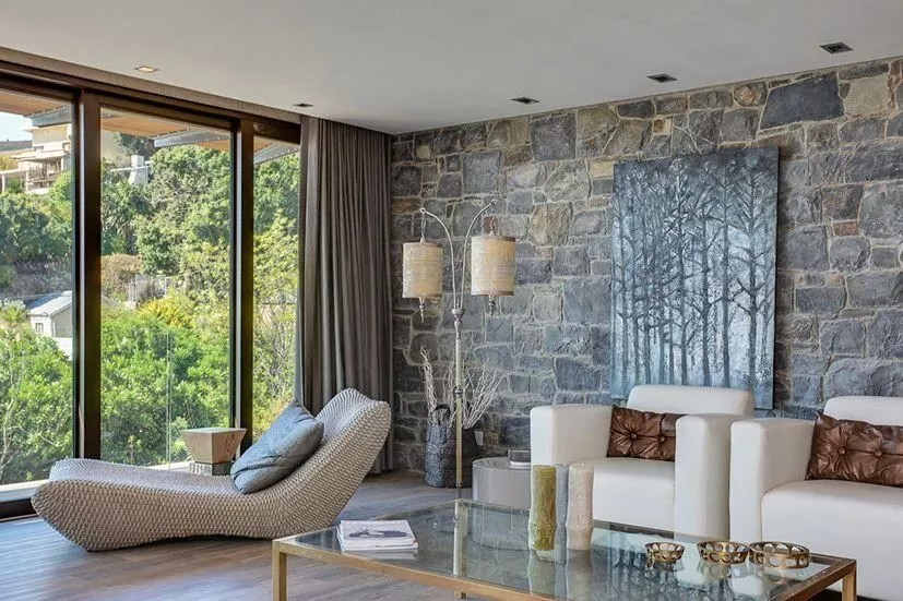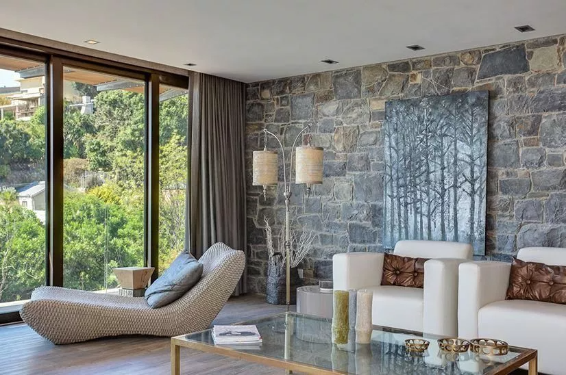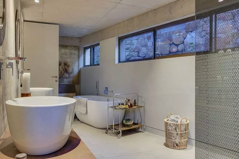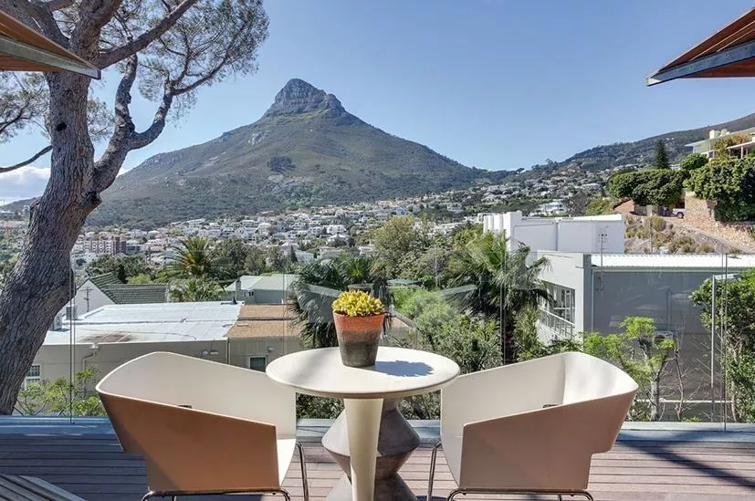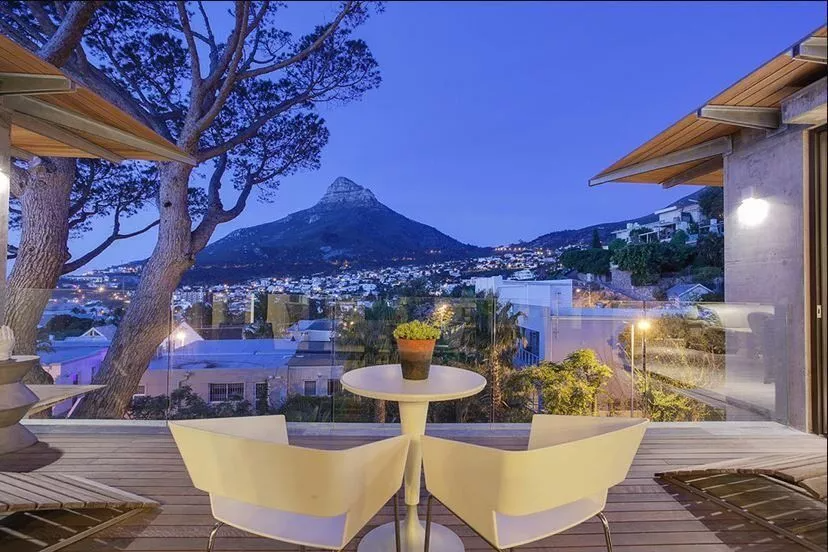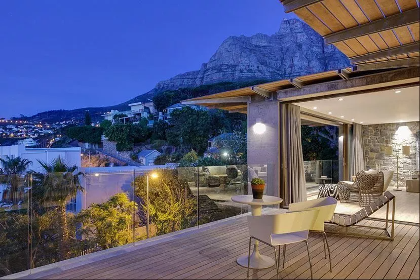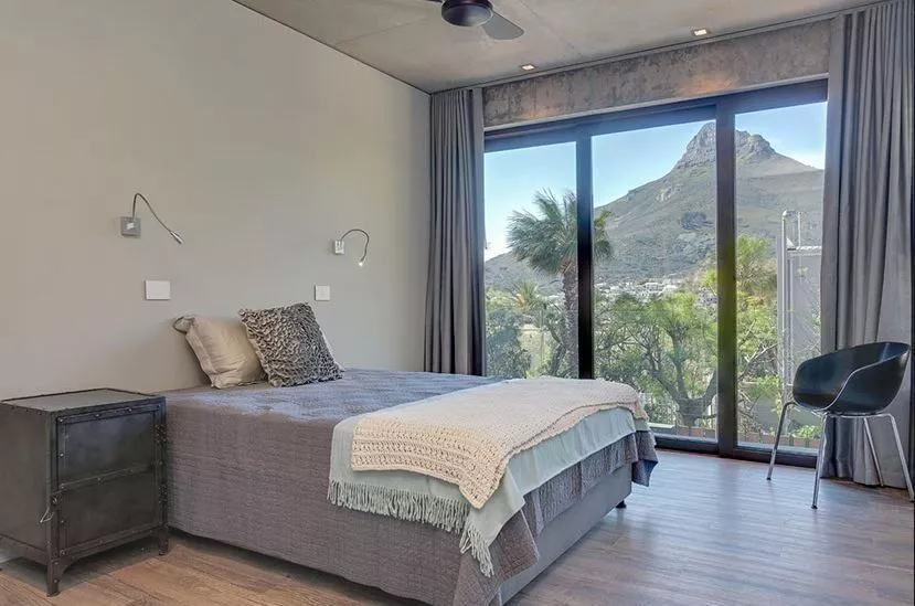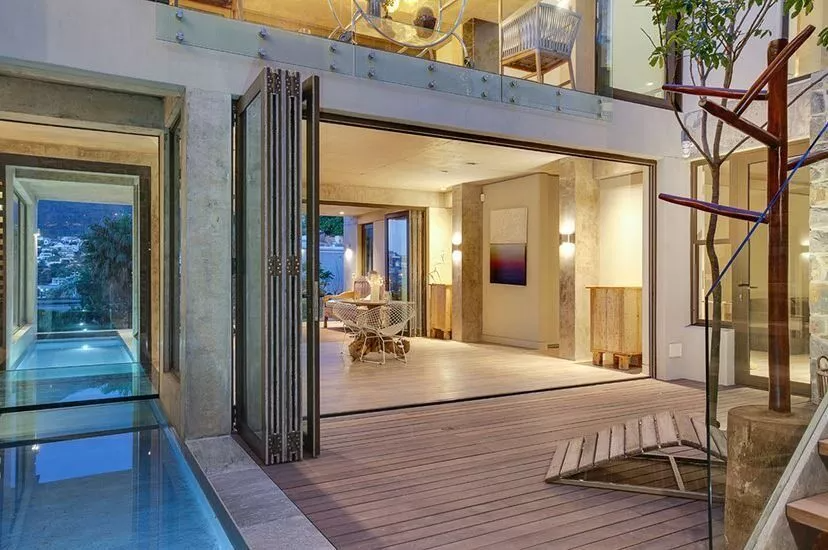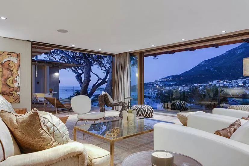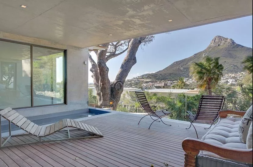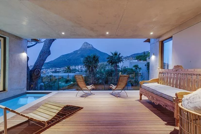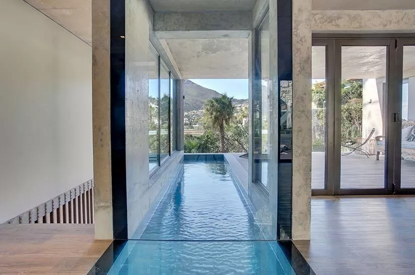 This modern, minimalistic 4-bedroom villa is situated in a quiet cul-de-sac and is within walking distance of Camps Bay’s main beach and the promenade. The interior is light and decorated in earth-tone colors creating a serene atmosphere which is emphasized by the pool which starts inside the house.