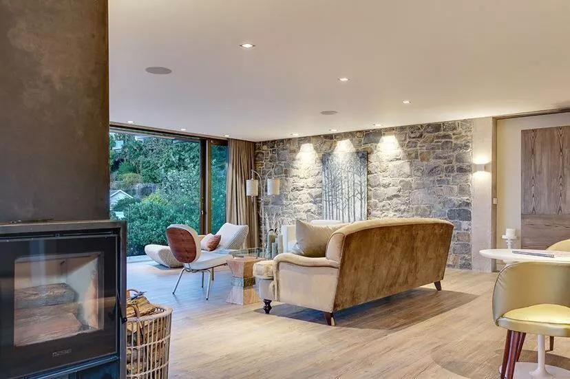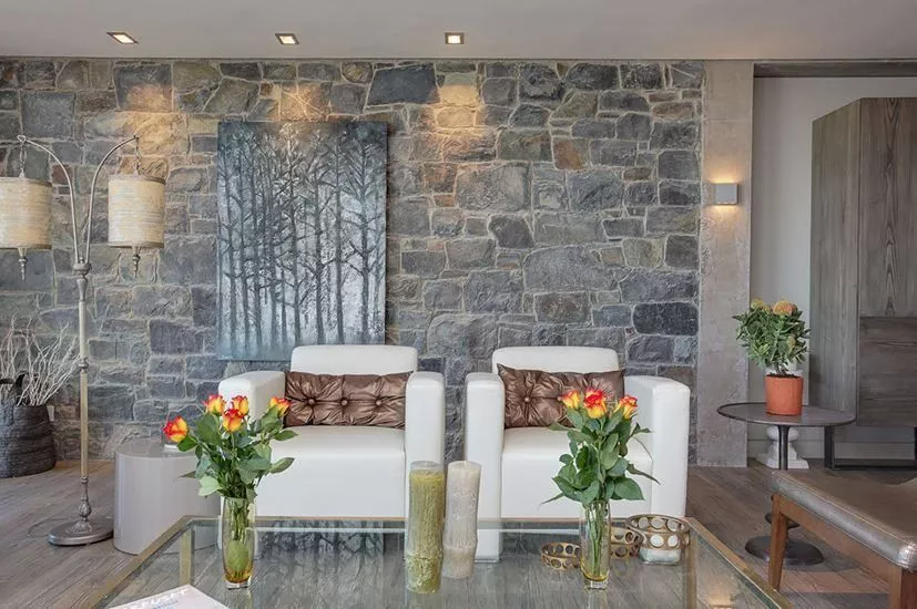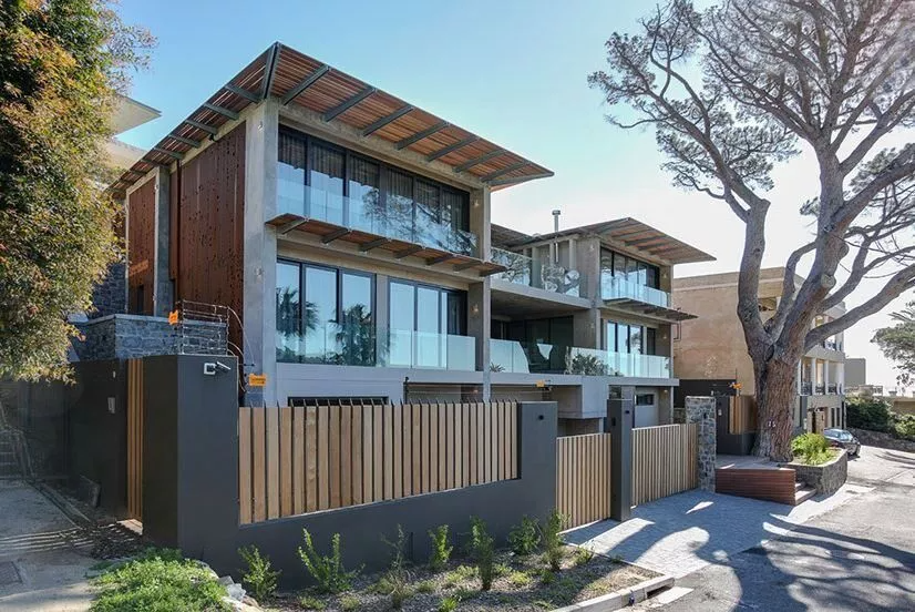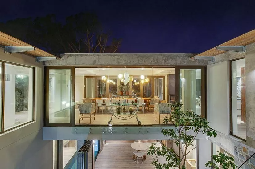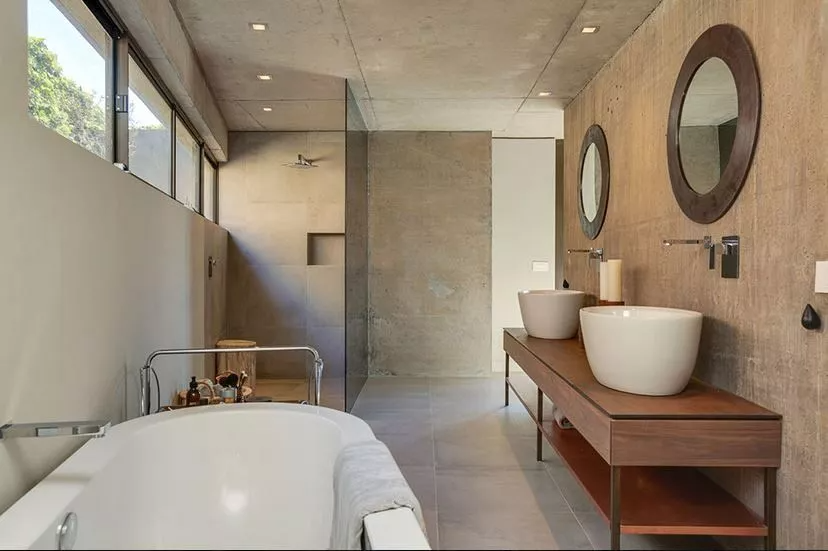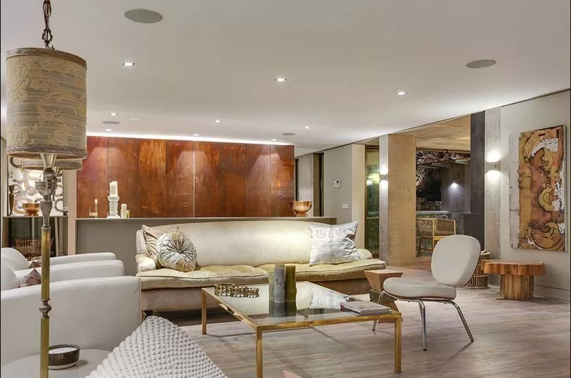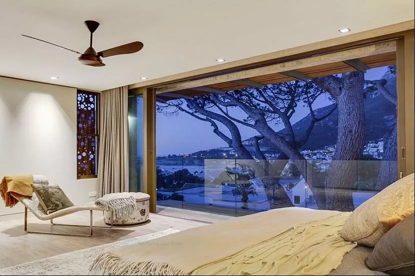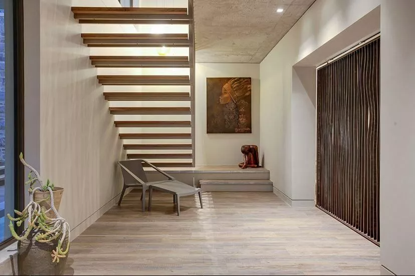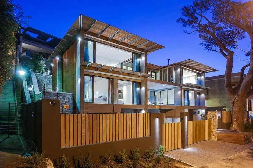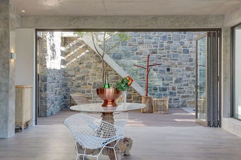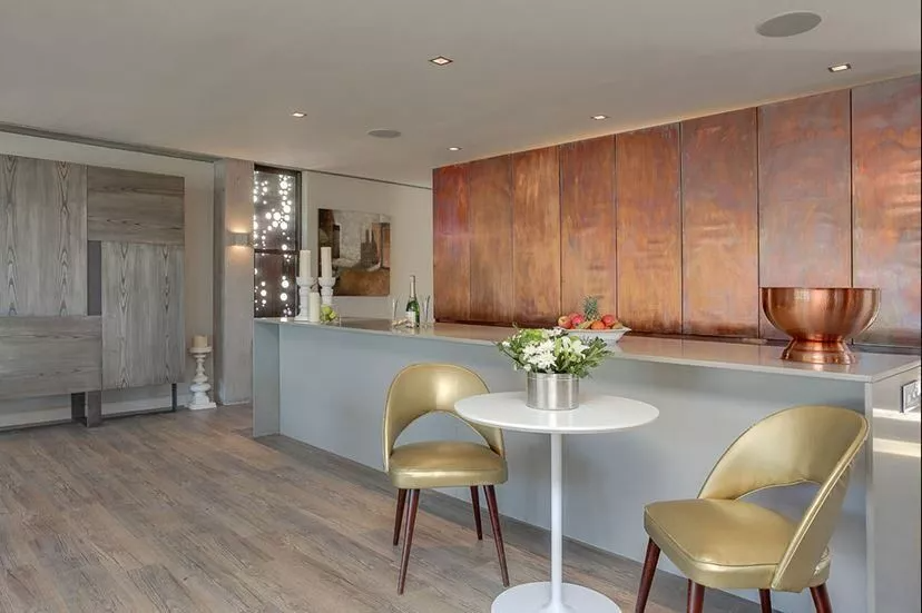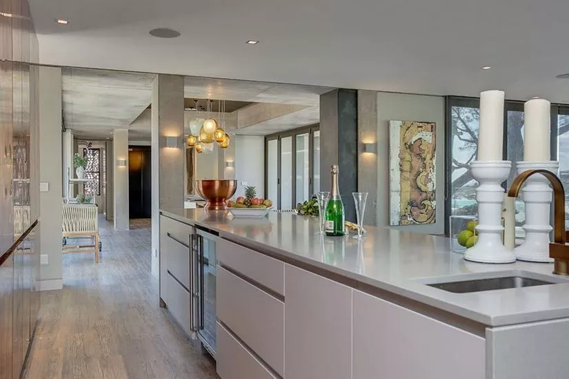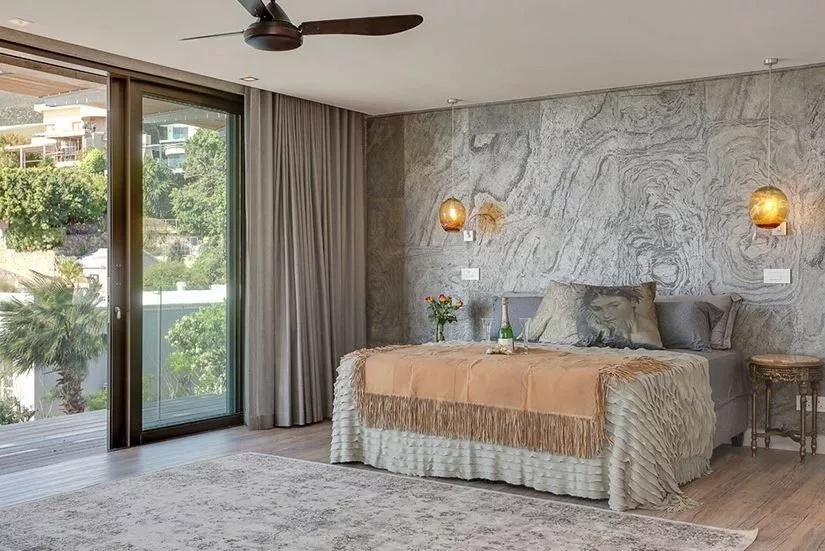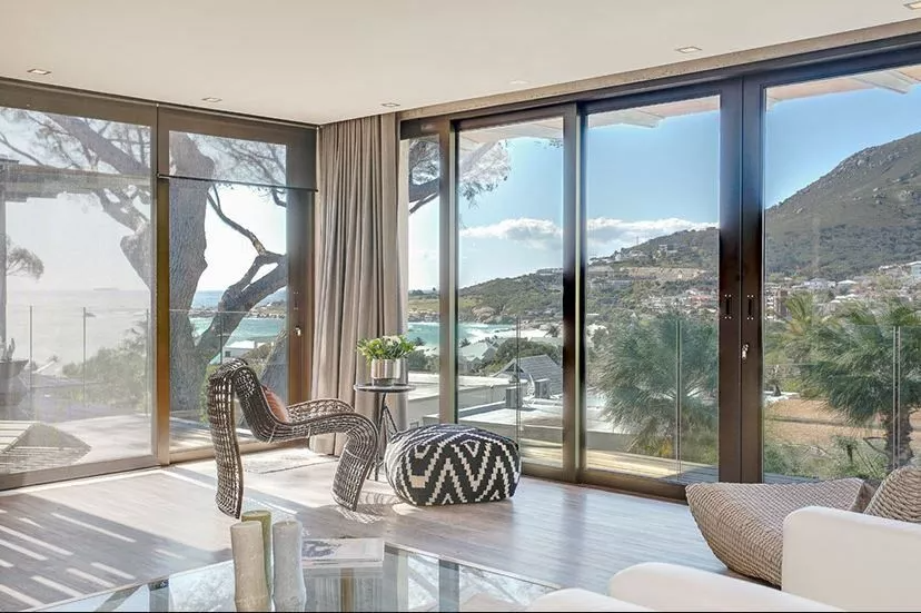 This modern, minimalistic 4-bedroom villa is situated in a quiet cul-de-sac and is within walking distance of Camps Bay’s main beach and the promenade. The interior is light and decorated in earth-tone colors creating a serene atmosphere which is emphasized by the pool which starts inside the house.