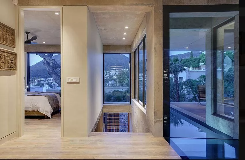A glass platform, crossing over the pool, leads into an open lounge with stackable doors on both sides which opens up to a pool deck with two sun loungers facing the sea and a wind-protected BBQ area facing the mountain.