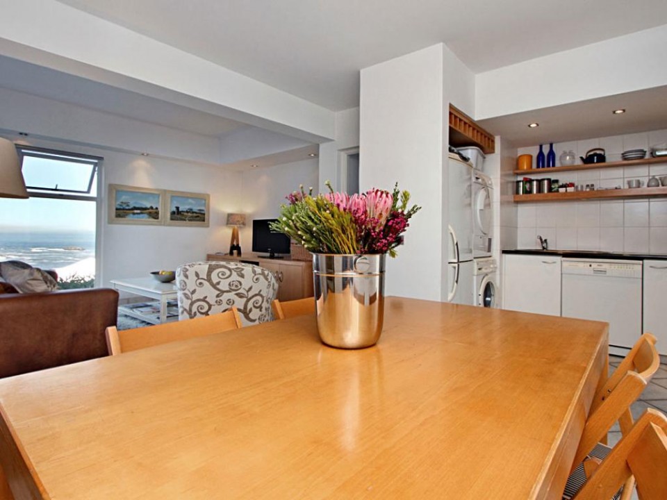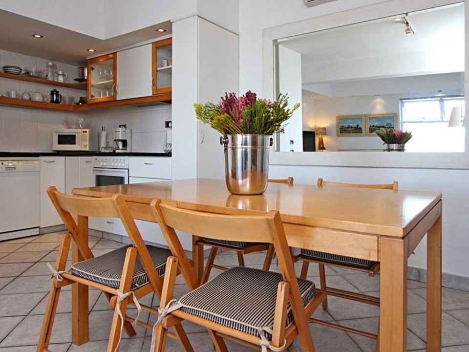 The lounge has a flat screen TV with full DSTV (Satellite) bouquet and DVD player. The dining area with a 4 seater dining table is open to the kitchen, perfect for casual entertaining. There is also air conditioning here.