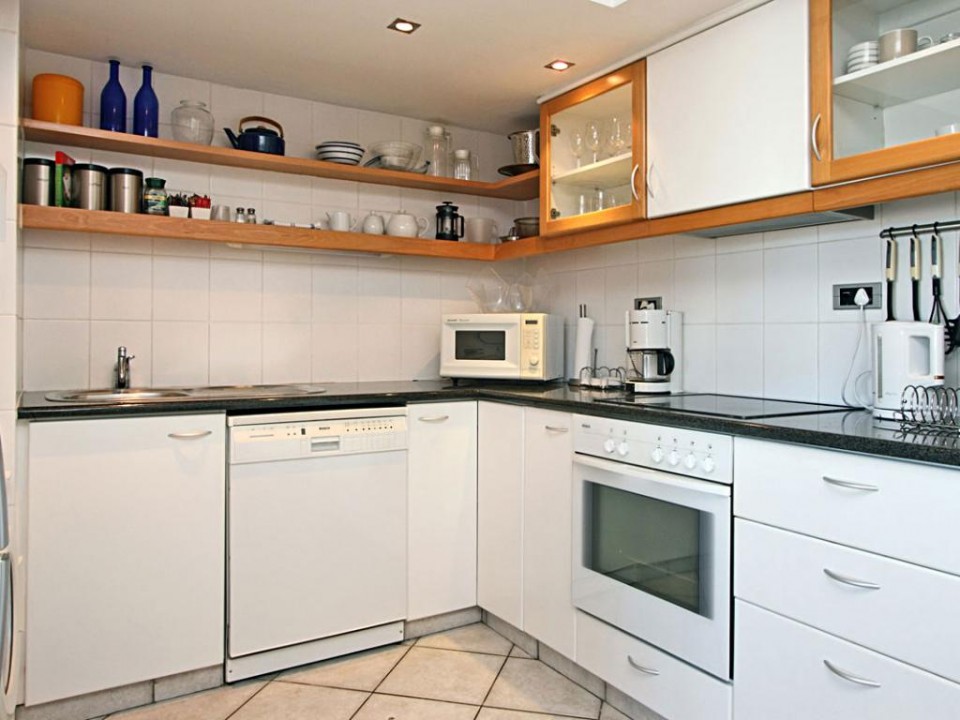 The fully equipped kitchen has quality appliances, including glass-top hob, under-counter oven, dishwasher, washing machine and tumble dryer. The en-suite bedroom has a queen-sized bed and A/C. The bathroom has a bath and overhead shower.