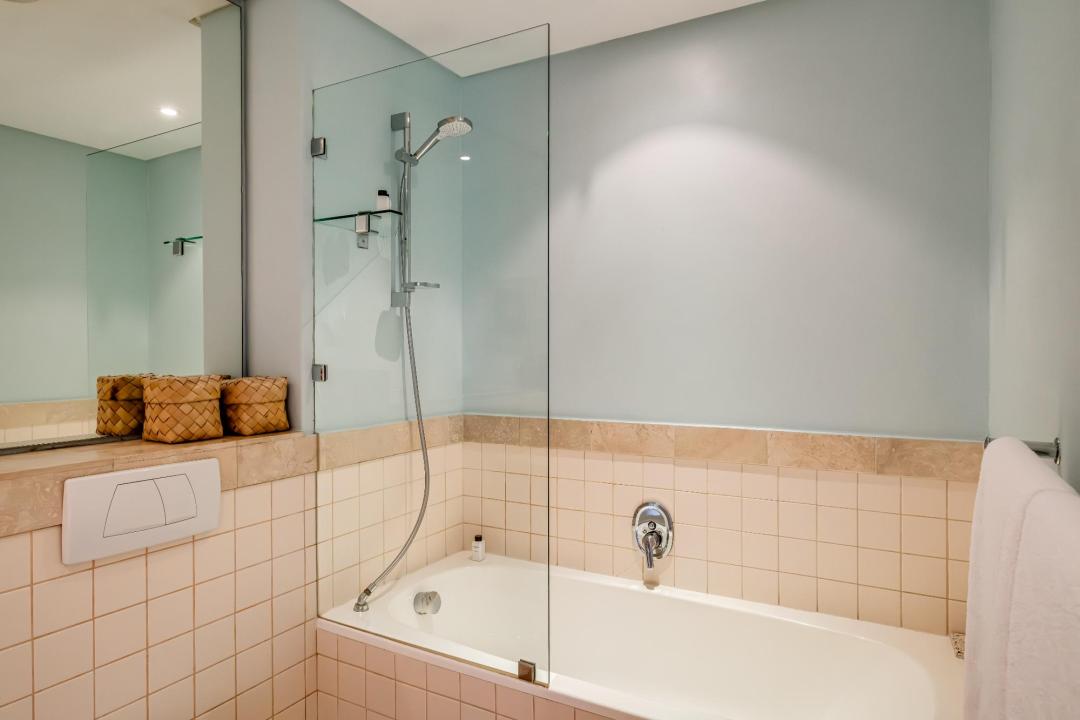 This light-filled two-bedroom apartment has been thoughtfully designed for both relaxation and convenience. The main bedroom features a double bed, air-conditioning, seating area, and balcony access with peaceful water views. Its en-suite bathroom includes a bath, shower, and double vanity. The second bedroom, also with a double bed and air-conditioning, opens directly onto the balcony and includes its own en-suite bathroom, creating a private haven for each guest.