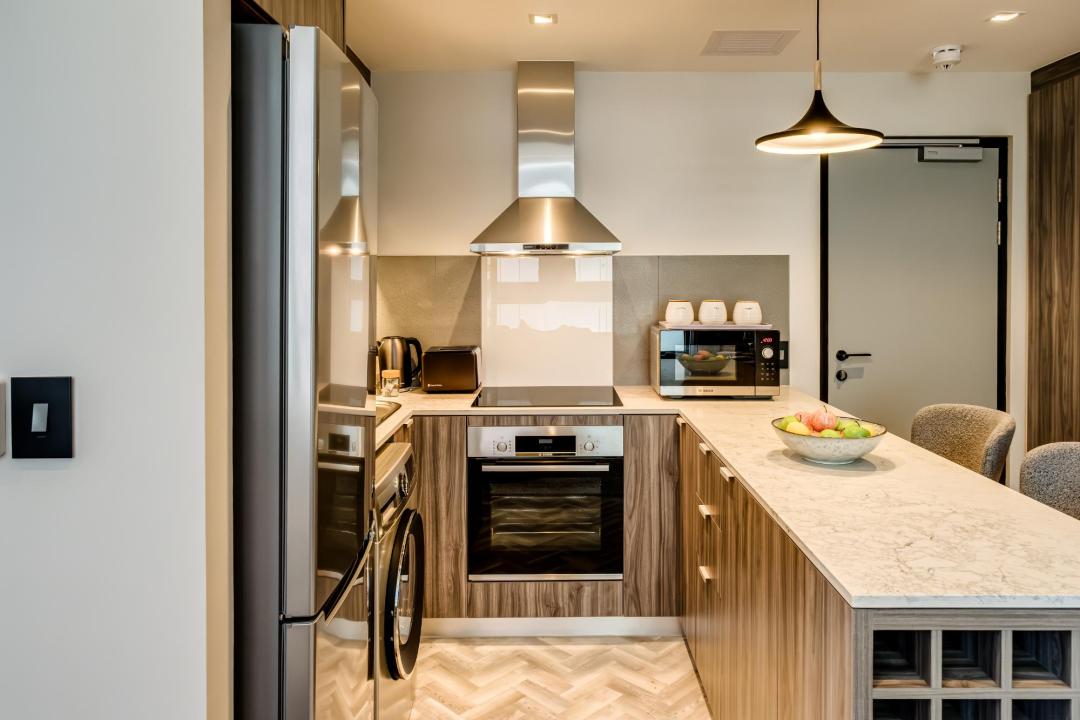 The well-appointed kitchen features an electric hob, Nespresso machine, and a washer/dryer combo, while the breakfast bar offers a perfect spot for two. The open-plan living and dining areas provide seating for three and a TV, ensuring a comfortable space to relax.