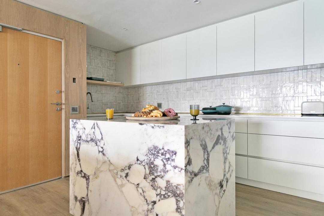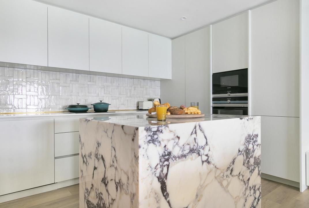 A modern kitchen with a central marble island offers state-of-the-art appliances, including a dishwasher and double sink for comfortable holiday living. A six-seater dining table has extraordinary sea views, and a beautifully furnished lounge area has plush furnishings and a SMART television.