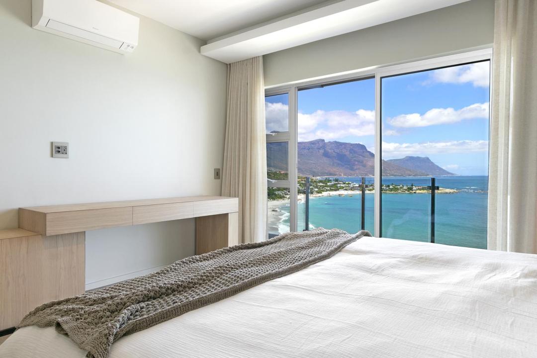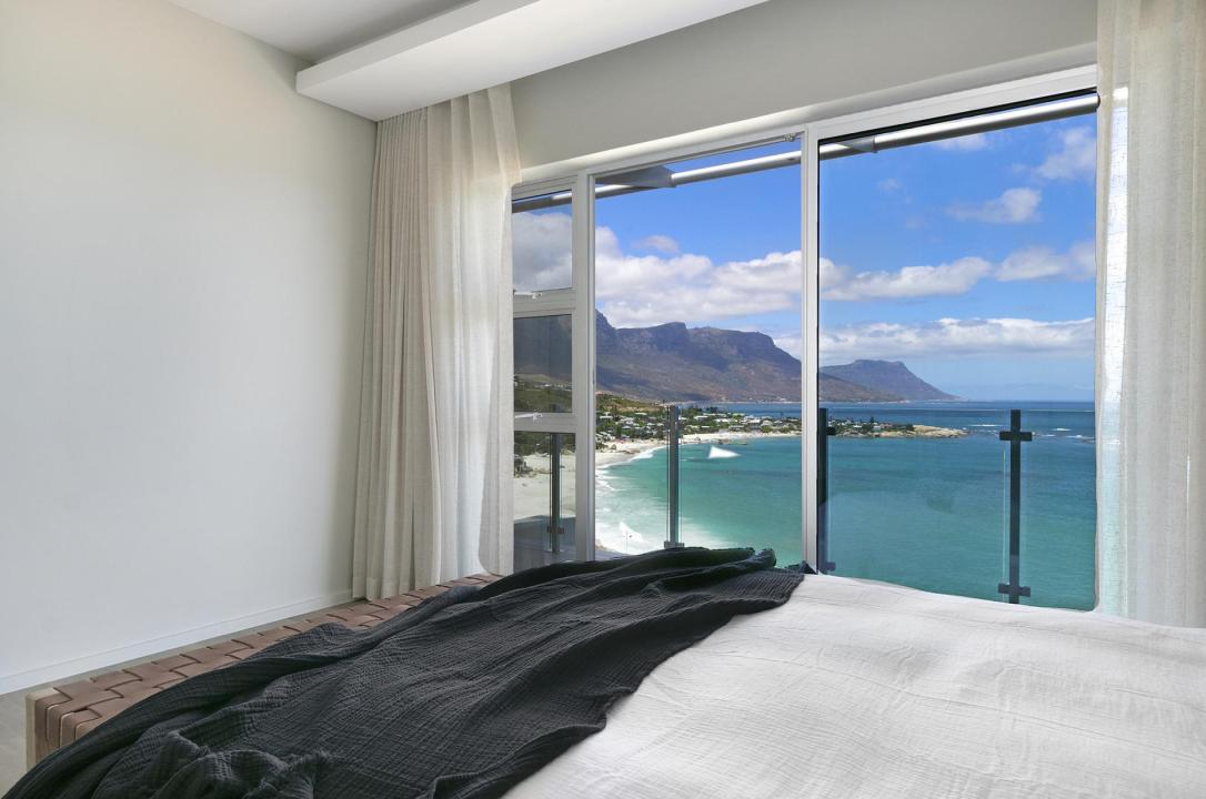 Commanding breathtaking views of the Atlantic Ocean, the master bedroom is decorated in creamy tones. The master has a king-sized bed, a walk-in dressing area with ample cupboard space, and a spacious en-suite bathroom with a beautiful bathtub and walk-in shower. This bedroom opens onto a private balcony that overlooks the sea and the four beaches of Clifton below.